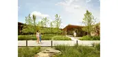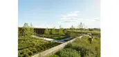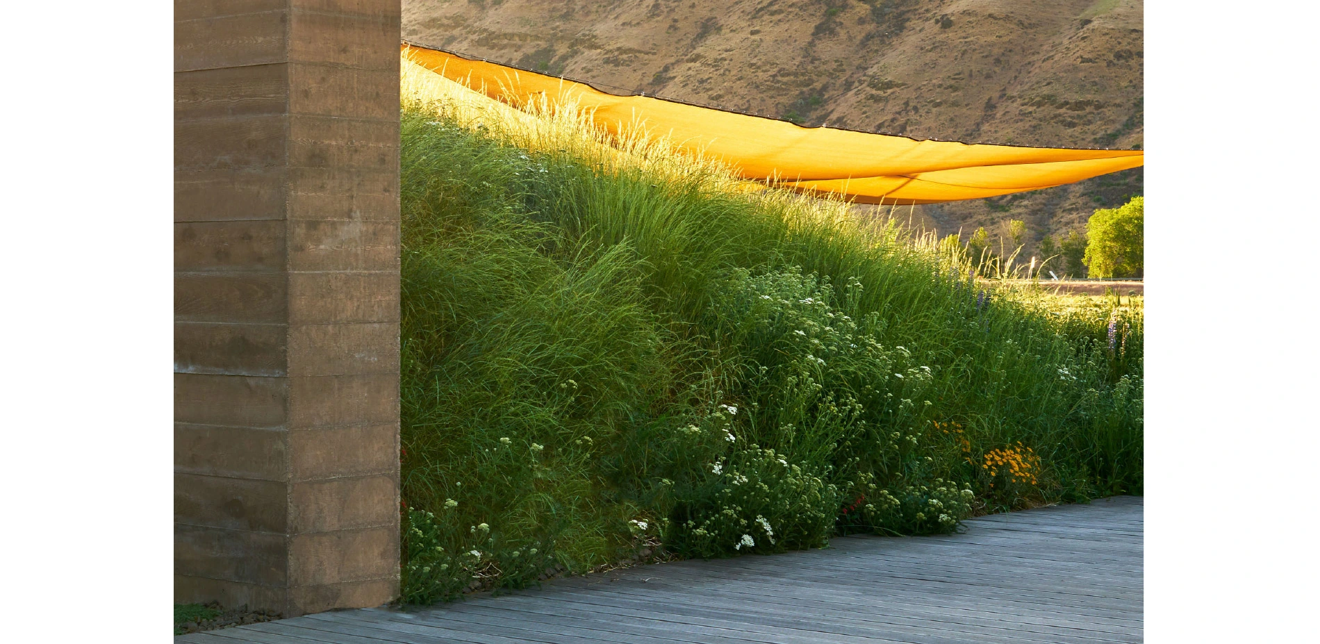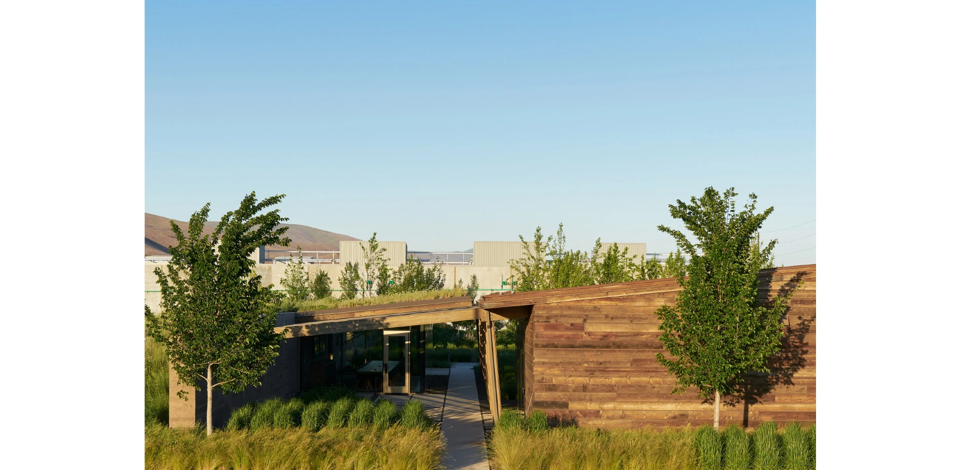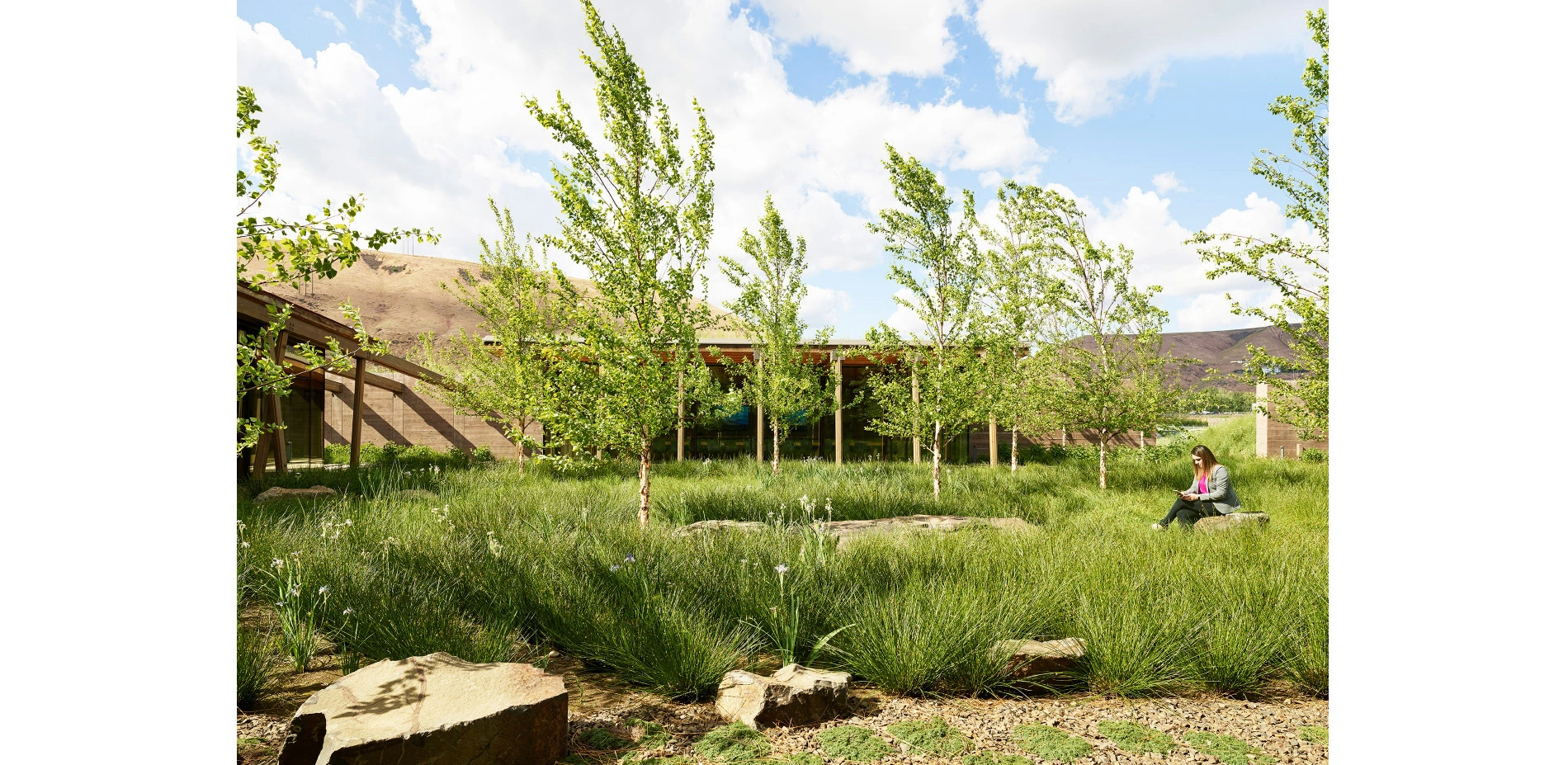 An Eastern Washington fruit and produce company has used carefully designed landscape to create a headquarters site that celebrates its connection to the region’s agricultural history and creates an inspiring work environment for its employees. Surrounded by a major highway, industrial buildings, and the company’s own processing facilities, a simple earthen landform of native plantings wraps the building and courtyard to make a calming, lush, inward-focused green oasis that resembles the local ecology in miniature. A walkway cuts through the berm, providing glimpses of the surrounding hills, and a green roof on top of the lunchroom reinforces the company’s intrinsic ties to the land.