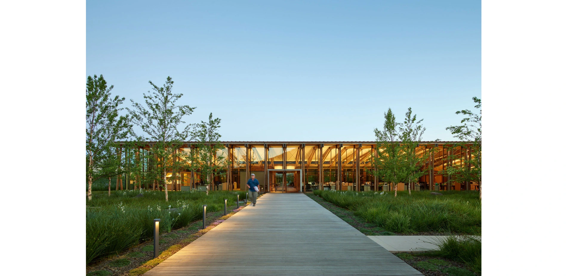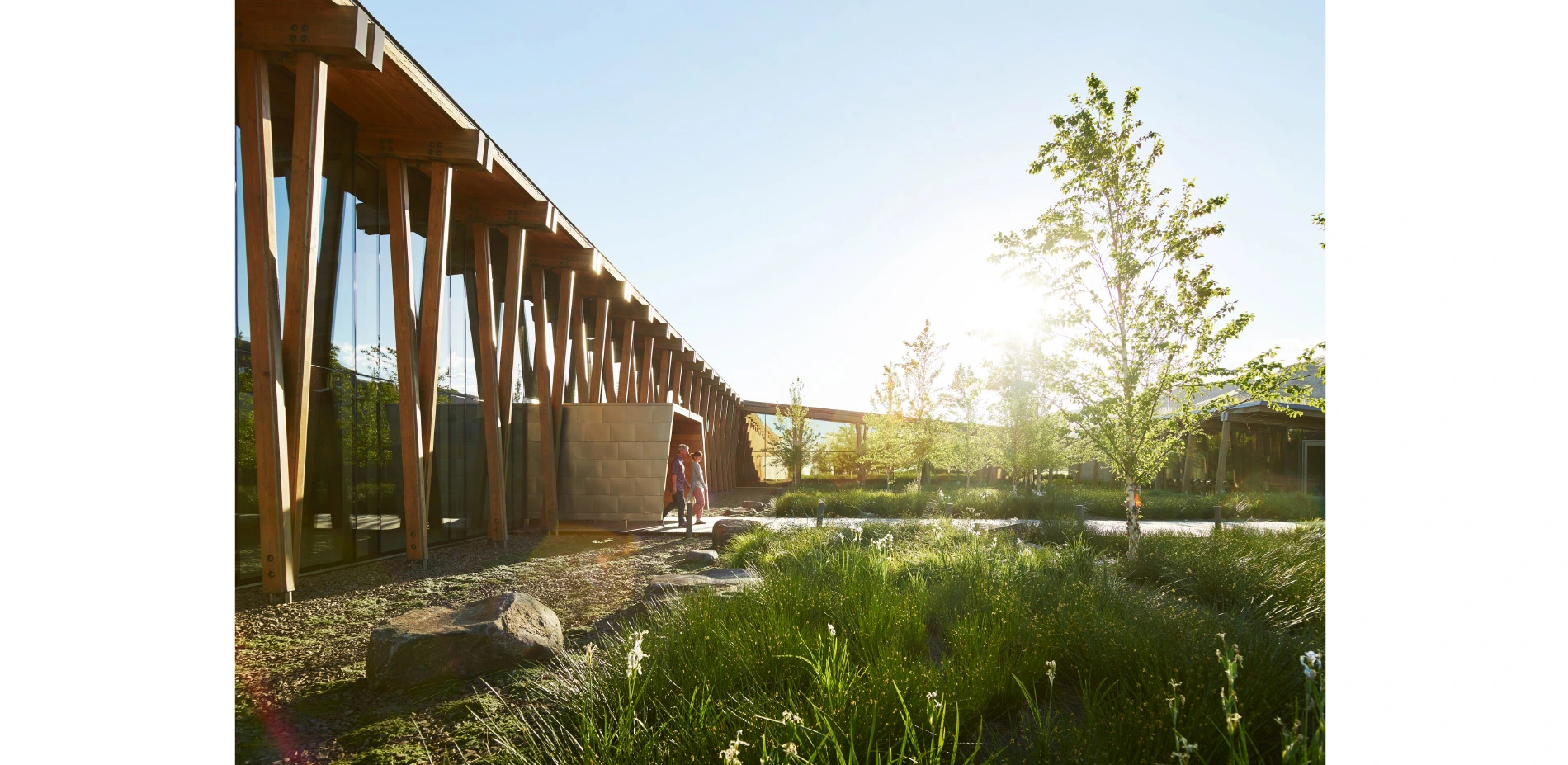 A wood-planked walkway, the main entry and exit point, bisects the courtyard and peels back the berm giving those leaving the site magnificent views of the distant hills and the gap through which the Yakima River passes. The entry walk is elevated slightly above the adjacent landscape giving the impression of a boardwalk, strengthening the riparian feel of the landscape. Floor to ceiling windows flood the interior with views, ensuring everyone visual access to nature and light.