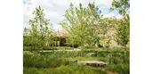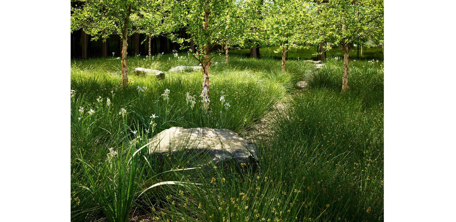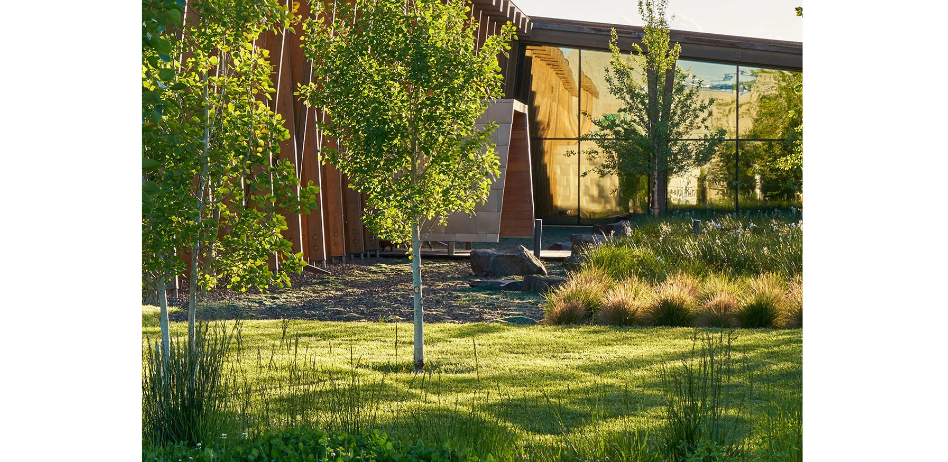 Native species from the nearby riparian corridor and the surrounding hillsides demonstrate their beauty and ability to adapt to a managed landscape. The planting recalls both natural patterns and the ordered row planting of the site's agricultural past. A reminder of some of the first ornamental trees planted in the valley, non-native but culturally significant DED-resistant American elms and sugar maples, provide shade for the parking areas. Native Rocky Mountain Iris bloom in the early summer adding a surprising pop of purple and blue.