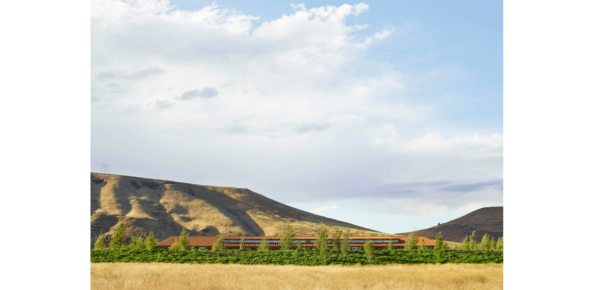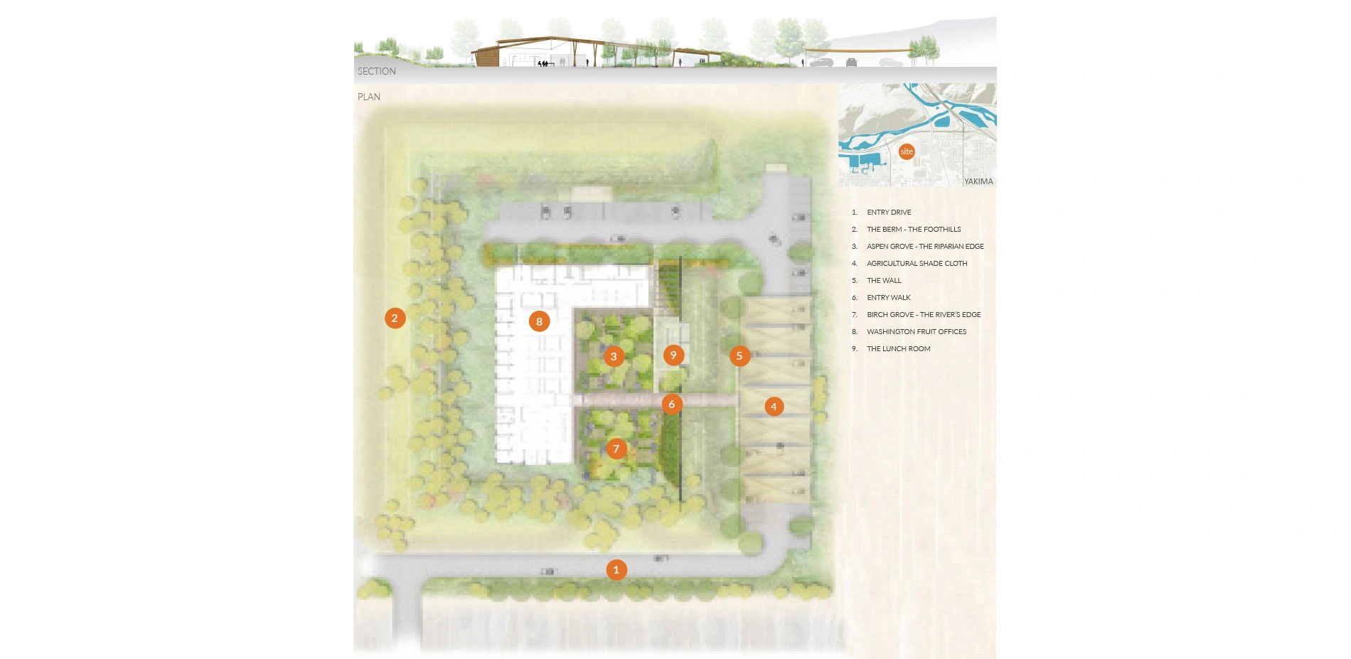 Washington Fruit & Produce Company grows and ships premium fruit around the world. The owners wanted to create a work environment representative of the company and their connection to the area's agricultural history. Located in arid Eastern Washington, surrounded by a major highway and industrial fruit storage and processing facilities, a simple earthen landform of native plantings wraps the building and courtyard creating a lush green oasis. This calming setting provides light-filled upward and inward views of the surrounding hills while screening the nearby industrial activities.