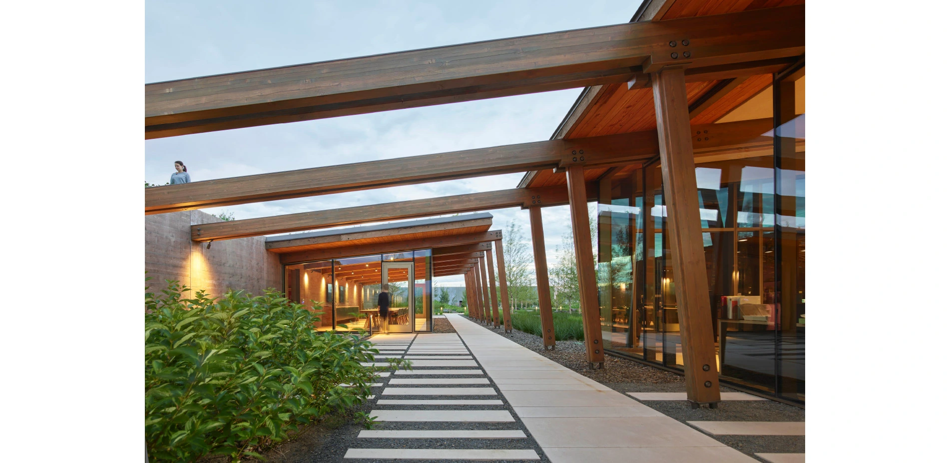 Washington Fruit and the community in which it resides have a strong connection to agriculture. The design team, who was shown an old barn as inspiration by the owner, sought to incorporate elements of that connection into the design. The core planting and native stones are laid out in a grid reminiscent of rows of orchards or crops. The grid dictates the layout of the building's structural framework, and the building itself is evocative of a portion of an old barn structure. An agricultural shade cloth stretched over a trellis typically used for growing hop vines marks the entrance and provides much needed cover from the bright sun for the parking area.