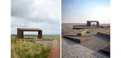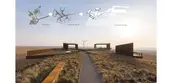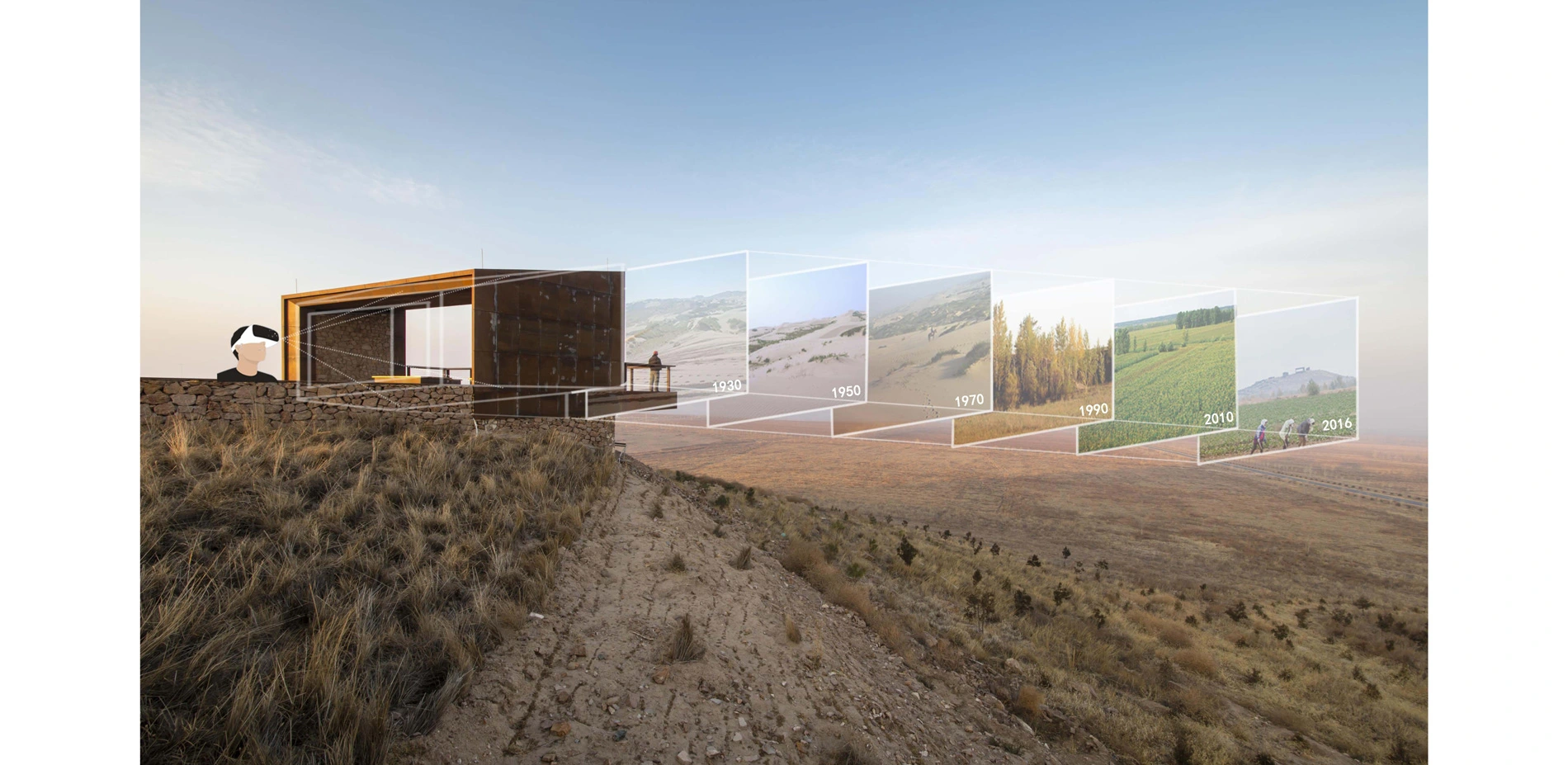 Tangible and Intangible InteractionAs a part of the scenic overlook, we designed pictorial frame structures presenting the current overall scene of the yellowhorn farm, which is part of the long history of battle against desertification taking on this site. Augmented reality technology was particularly introduced to the viewing experience. A chronological series of digital scenarios representing stories significant to the battle against desertification were created by the design team, collaboratively working with historians and local government, and added to onsite augmented reality devices. These could be held by visitors, allowing them to experience a two-dimensional real and virtual interaction that overlaps the desertification with the history of the desertification battle and visionary future landscape, all in a single framed scene.