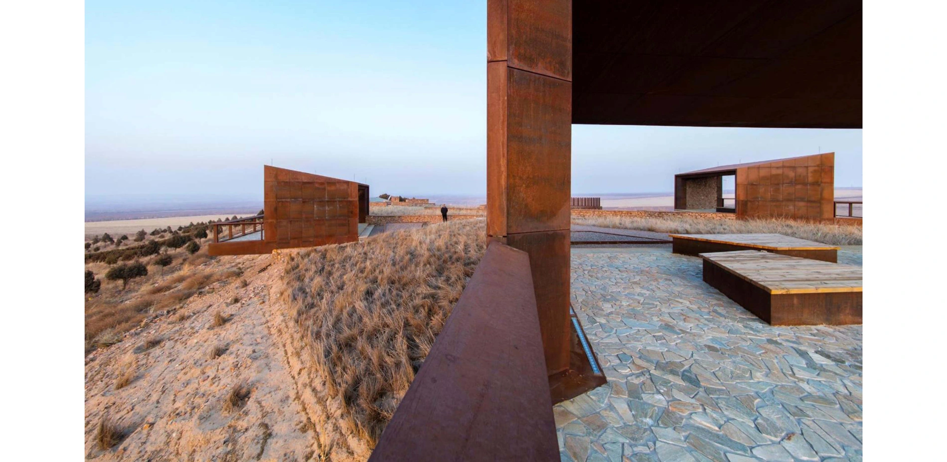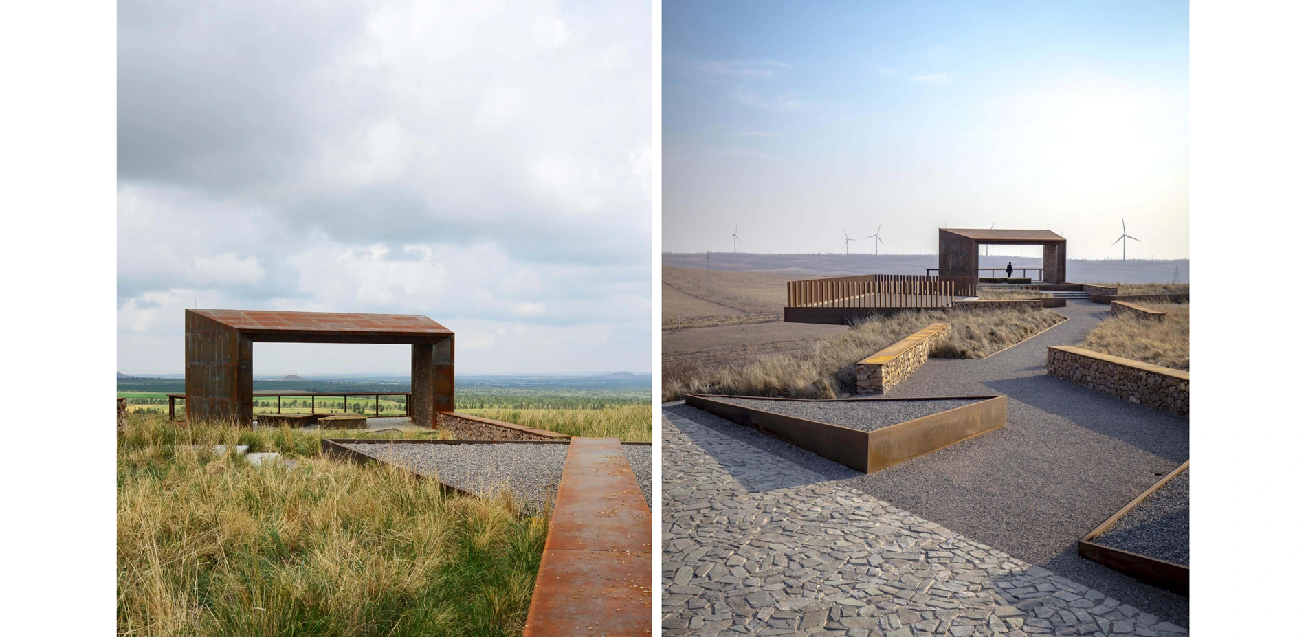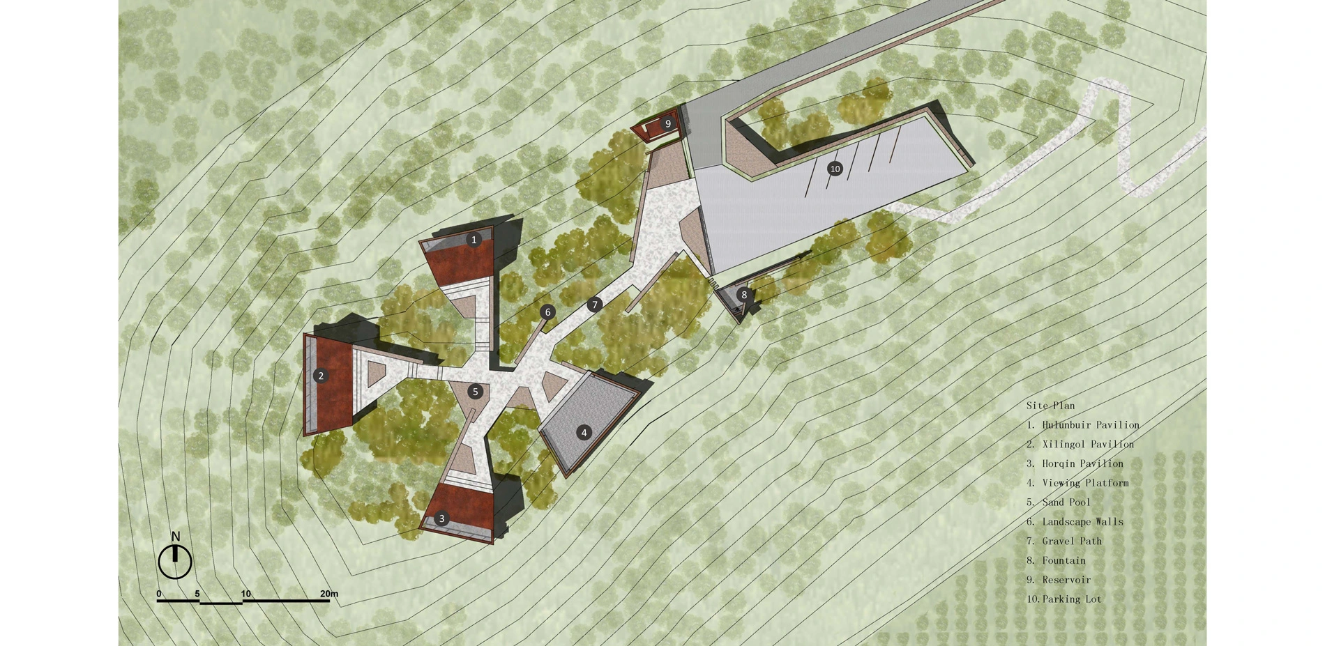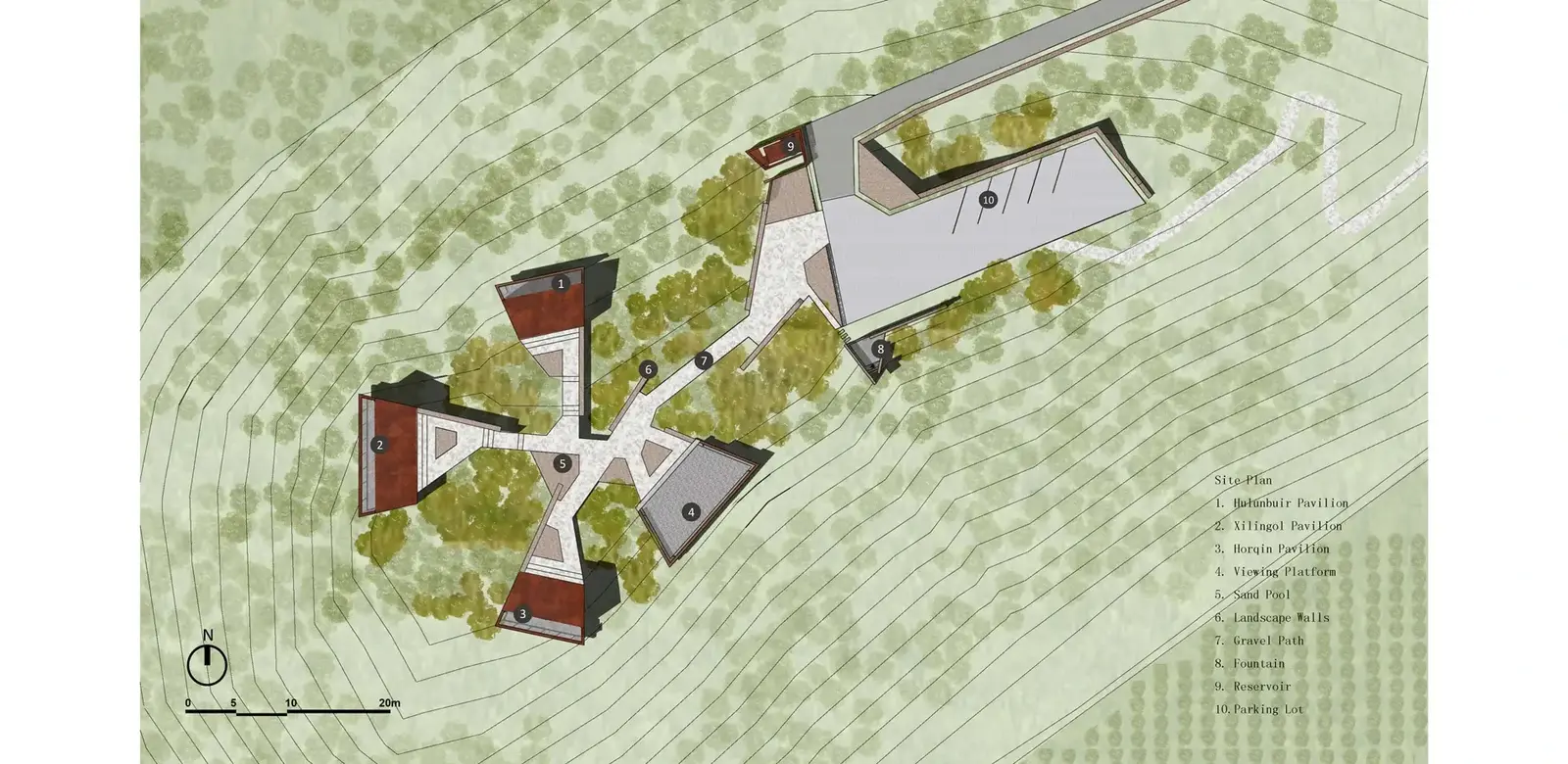 Historical Landscape ArchitectureThe overall landscape architecture was designed with a radial concentric shape consisting of three semi-open viewing pavilions and one fully open overlook. The geometry of the park was inspired by the leaf structure of the yellowhorn tree, a plant species that has been instrumental in reversing the area’s desertification and promoting local economic prosperity. The three semi-open viewing pavilions positioned in different directions represent the other three historical campaigns waged against desertification on the Mongolian Plateau: Hulunbuir grassland (to the north), Xilingol grassland (to the west), and Horqin grassland (to the south). Together, these features serve as an historical place epitomizing the natural and historical practice of reversing the desertification of the Mongolian Plateau.