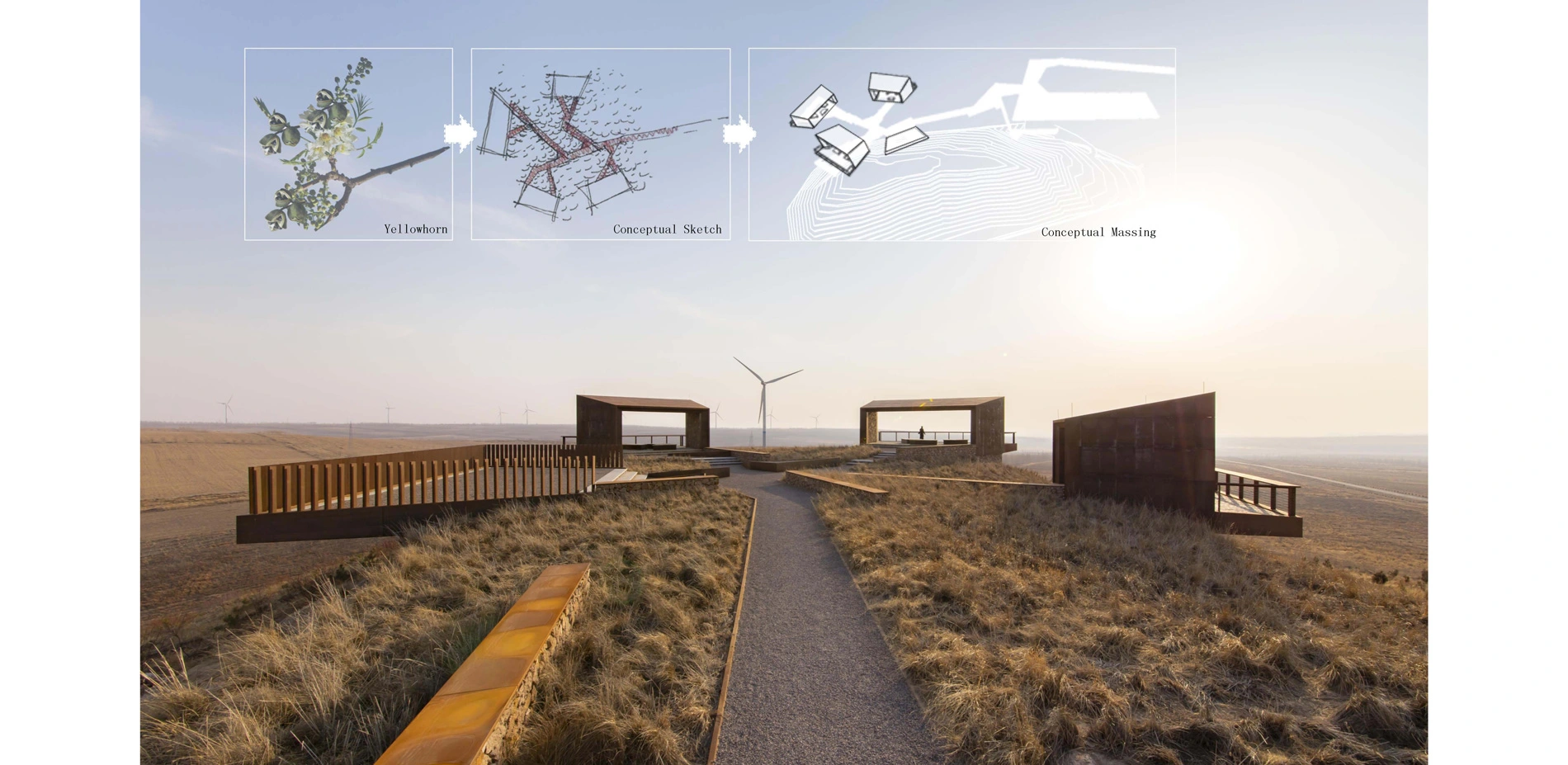 Design ContextYellowhorn is a native species that thrives in harsh desert climates, stabilizes soil, retains moisture, and provides oil-rich seeds. At this project site today, the yellowhorn farm spans 150 acres and has begun to attract immigration and boost the local economy. This farmland has been also integrated within a greater wind energy program supplying renewable energy for both farmlands and local villages. The project was initiated by the Yellowhorn Exhibition Center and Aohan County government in 2013. The concept is to commemorate the work that has been done to combat desertification on the Mongolian plateau, exemplify the transformation from desert to commercially viable farmland, and promote the vitality of local villages through the landscape. A series of public meetings with local governments, communities, village residents, farm employees, and scientists in the agriculture, geology, ecology, and humanities fields gave this project a true sense of place that connects it with the heritage, spirit, and attitude of those battling desertification.