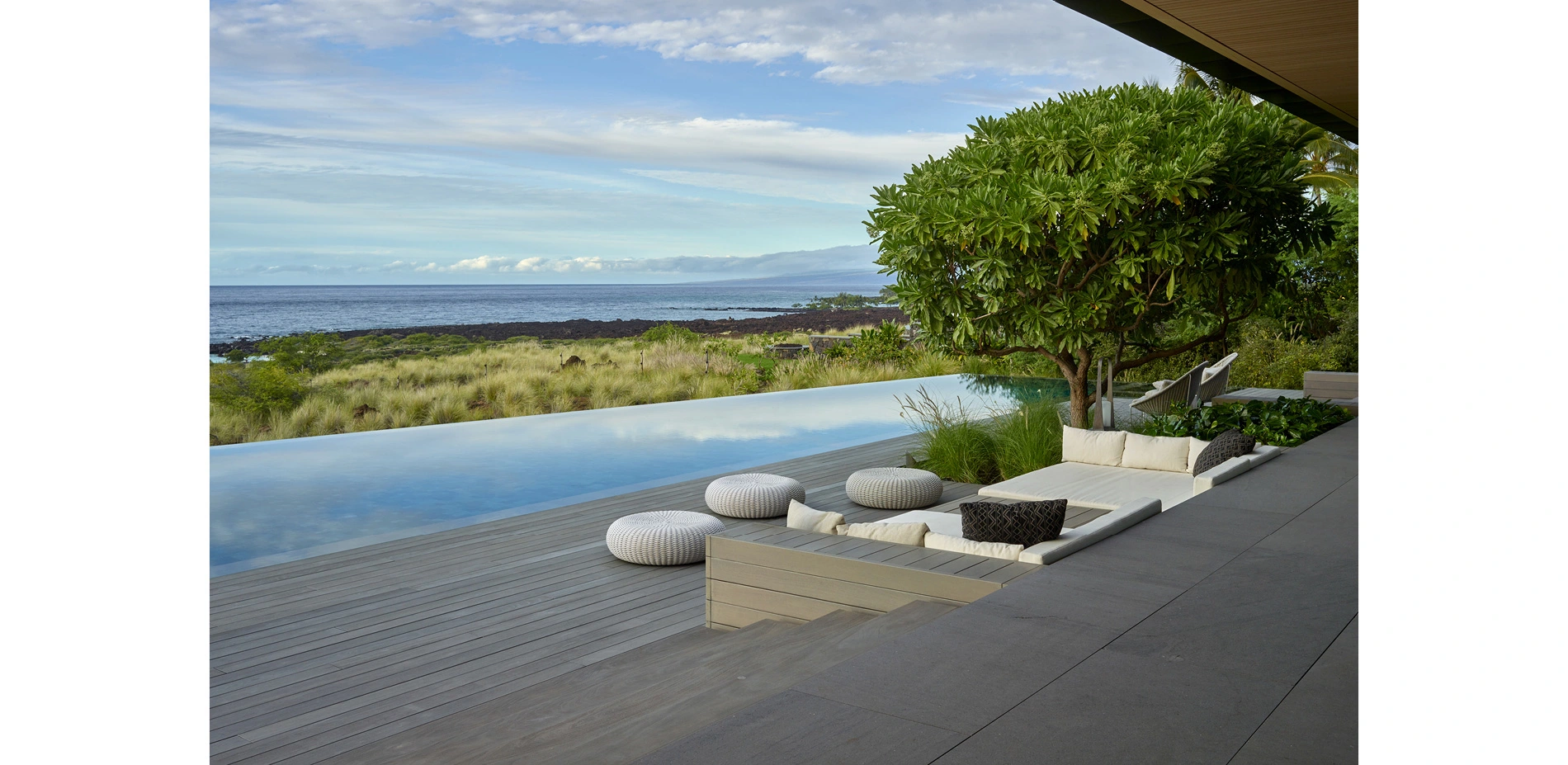 The site’s orientation was a second influence on the design approach. The lot is long and narrow, lying on a transect between the nearest mountain top, Hualalai, and the coast. In Hawaii, the mountains and ocean always define direction. The words Mauka, mountain side, and Makai, ocean side, are often more useful than North and South, as the major roads all follow the coastline. In response, the site design sequences distinct landscape spaces that emerge from lava rock and culminate in a sweeping view of the ocean.