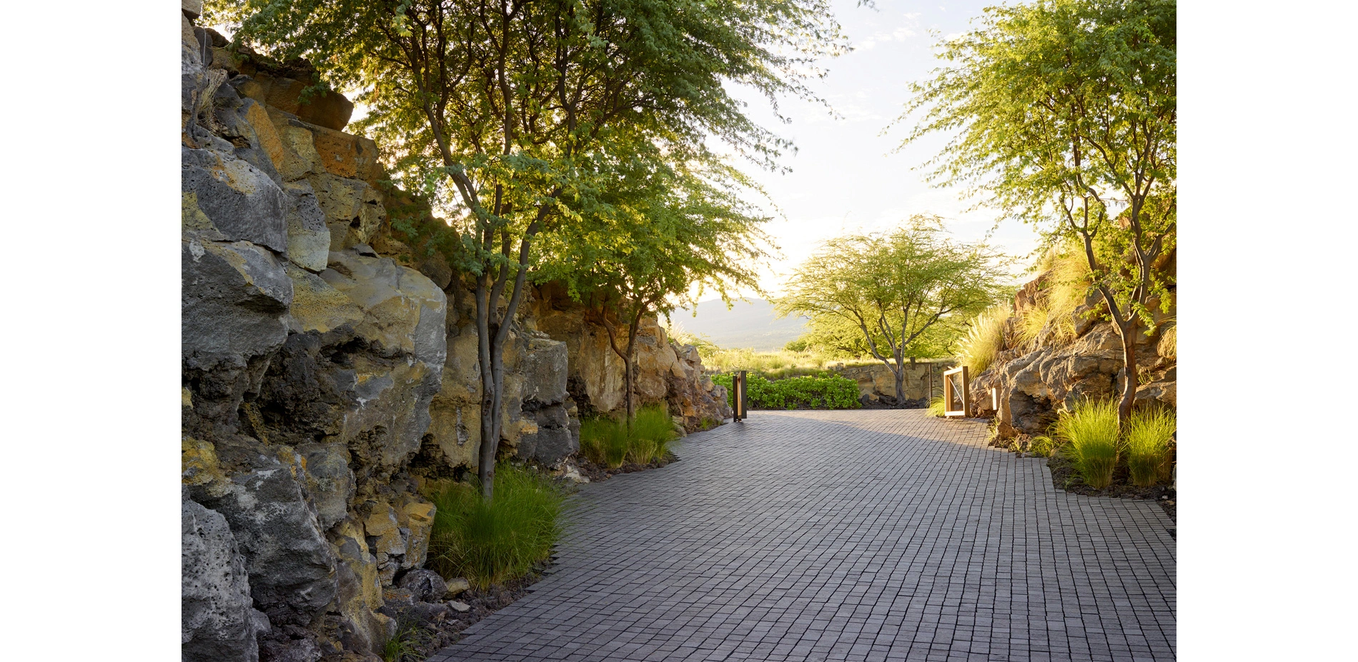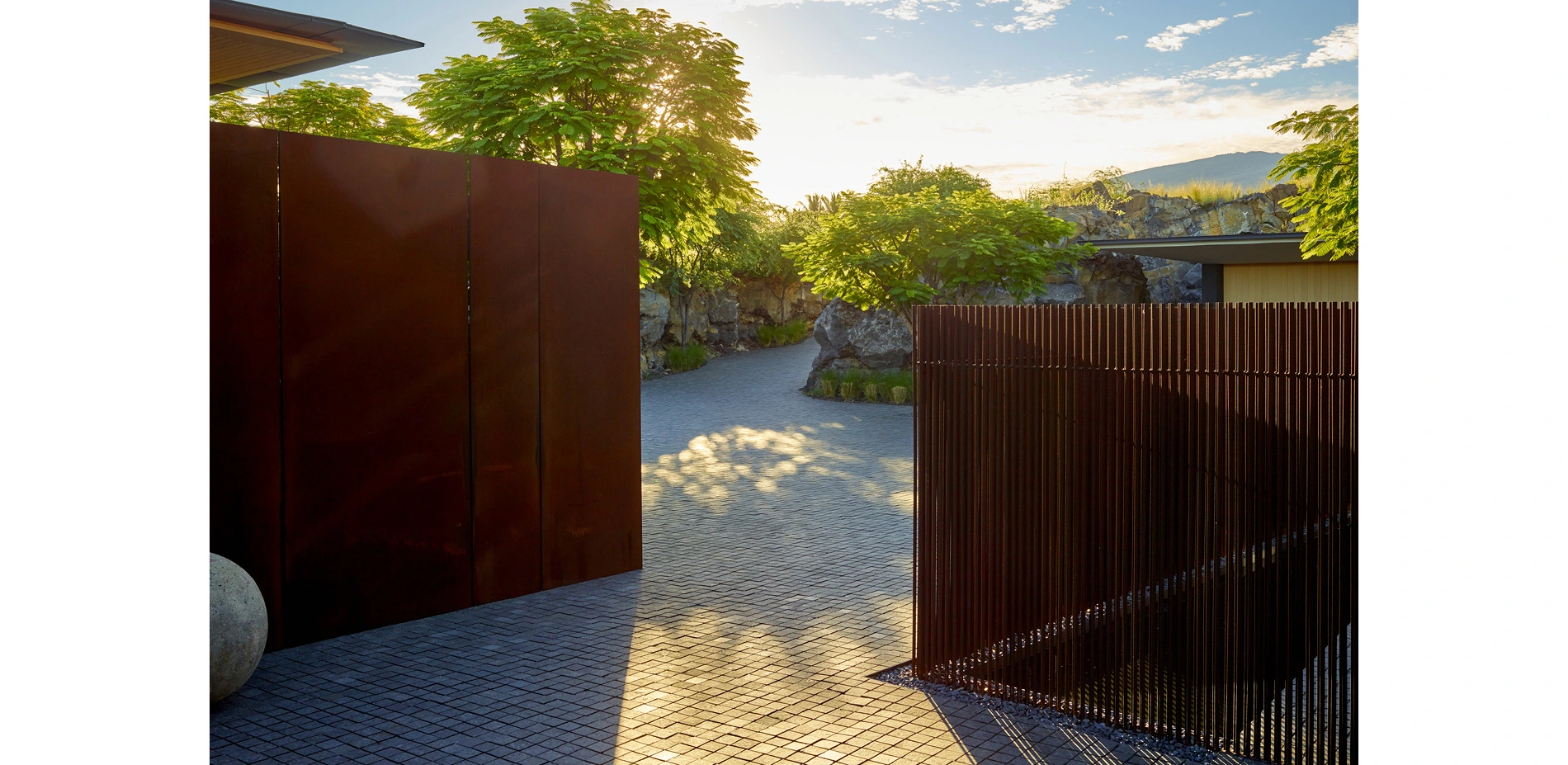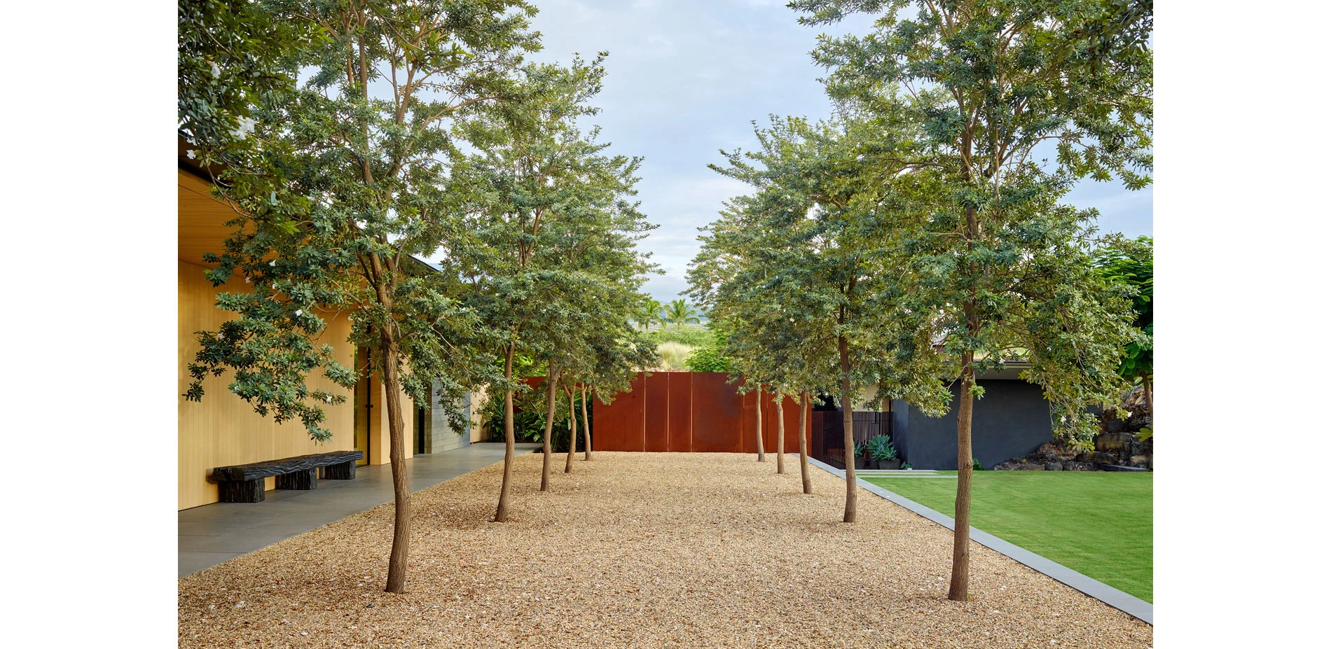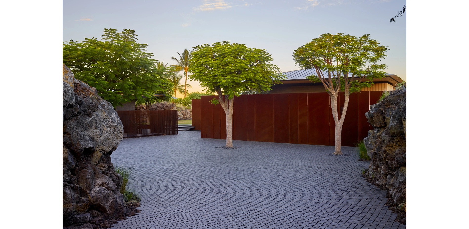 The site journey begins in a mountain landscape. The driveway cuts an arcing channel through ten feet of raw lava rock on either side. Black basalt cobbles flow from wall to wall, filling the edges of the excavation like a lava flow. The contemporary, refined paving material is at home in the rocky landscape while contrasting with the rough landforms. Pennisetum grasses and wispy Kiawe trees pull in the color and texture of the raw surrounding landscape. The arrival court intensifies the refined interpretation of the wild lava landscape. Flame trees puncture the basalt paving. Weathered steel panels and rows of steel rods enclose the space and screen the interior courtyard from view.