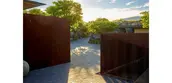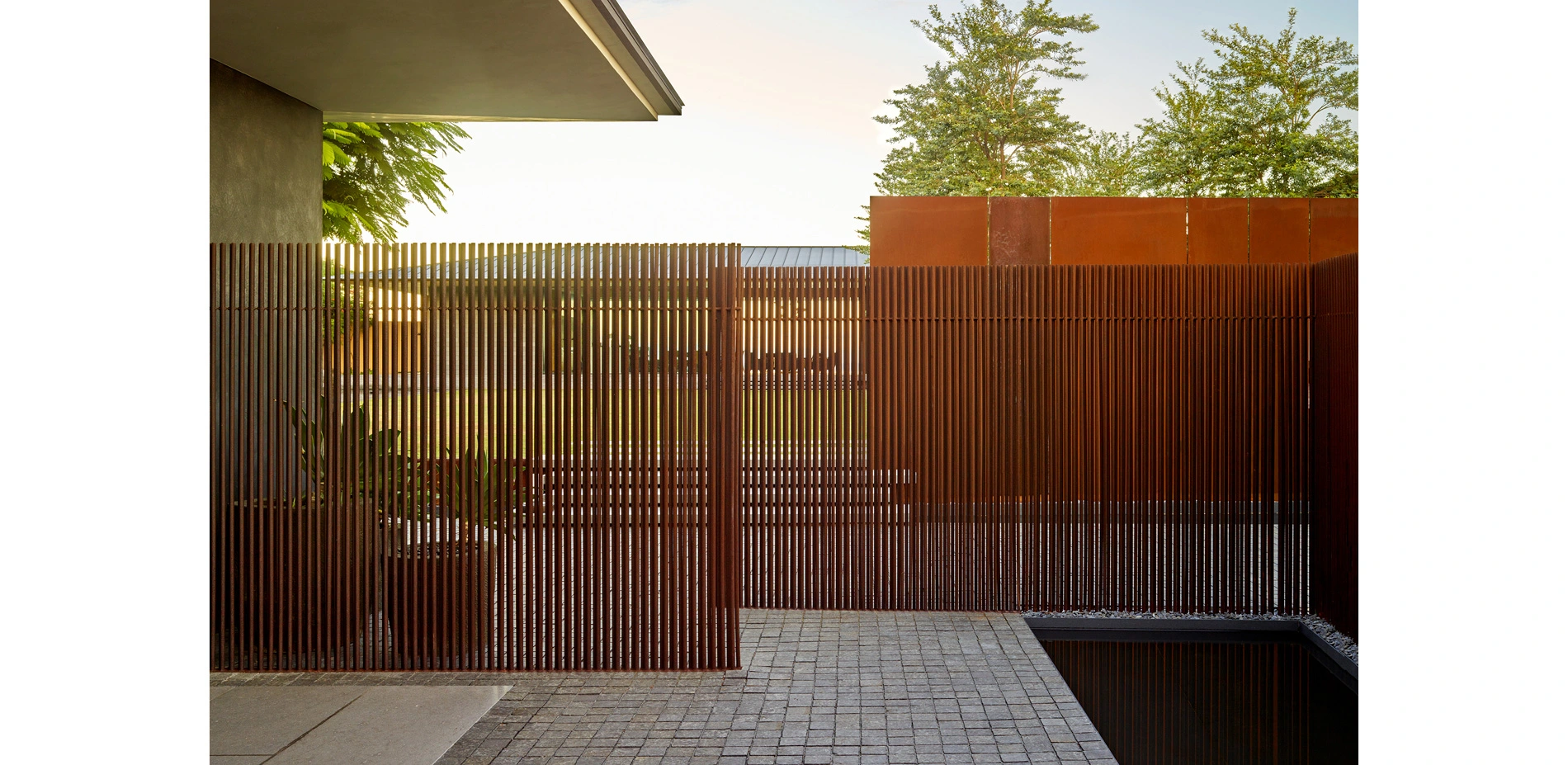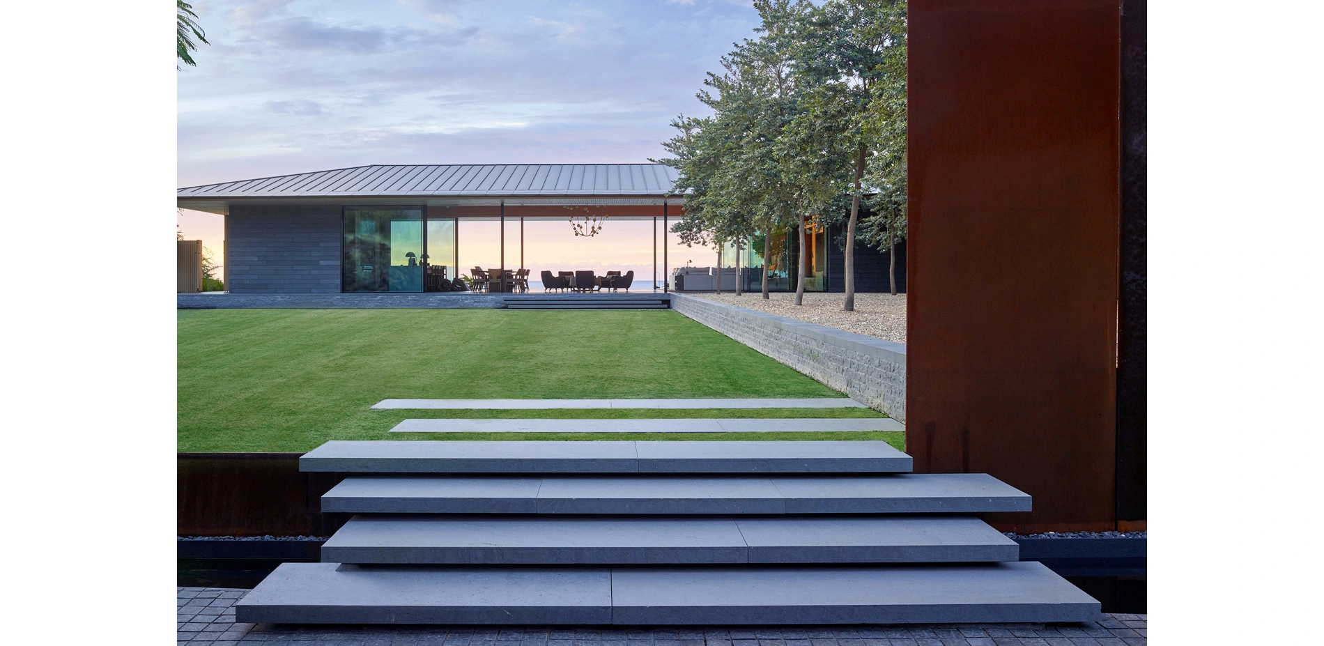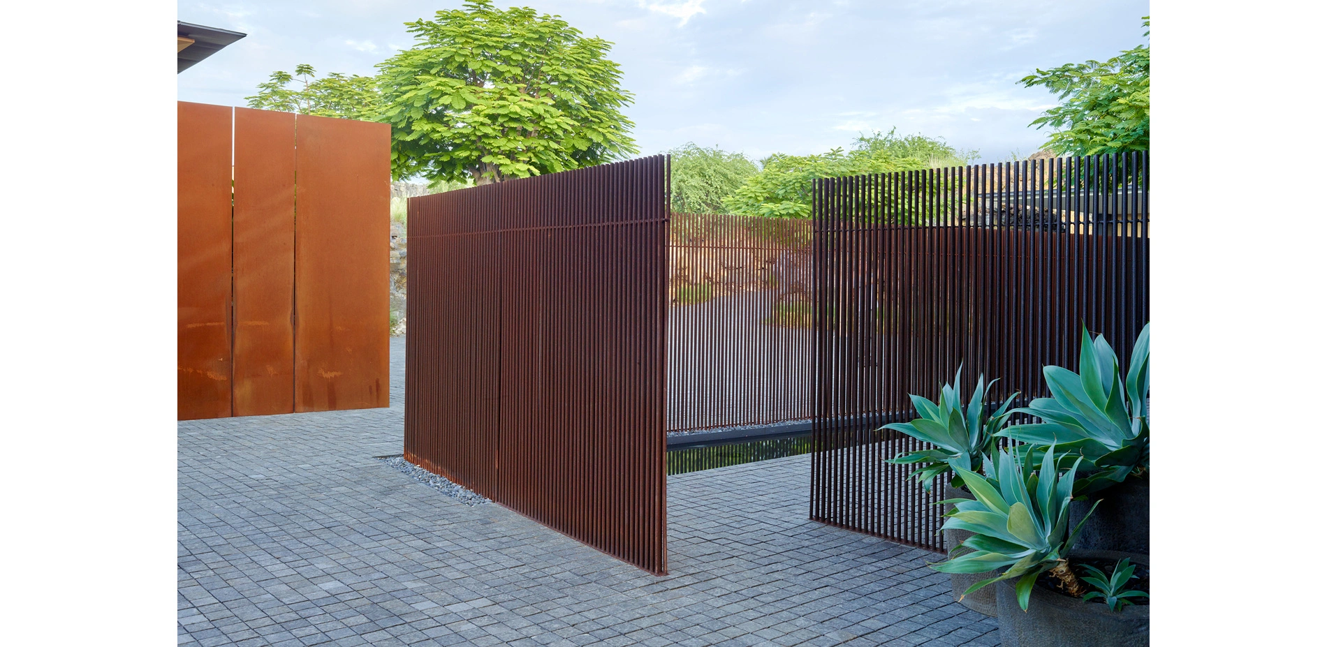 The site journey begins in a mountain landscape. The driveway cuts an arcing channel through ten feet of raw lava rock on either side. Black basalt cobbles flow from wall to wall, filling the edges of the excavation like a lava flow. The contemporary, refined paving material is at home in the rocky landscape while contrasting with the rough landforms. Pennisetum grasses and wispy Kiawe trees pull in the color and texture of the raw surrounding landscape. The arrival court intensifies the refined interpretation of the wild lava landscape. Flame trees puncture the basalt paving. Weathered steel panels and rows of steel rods enclose the space and screen the interior courtyard from view.