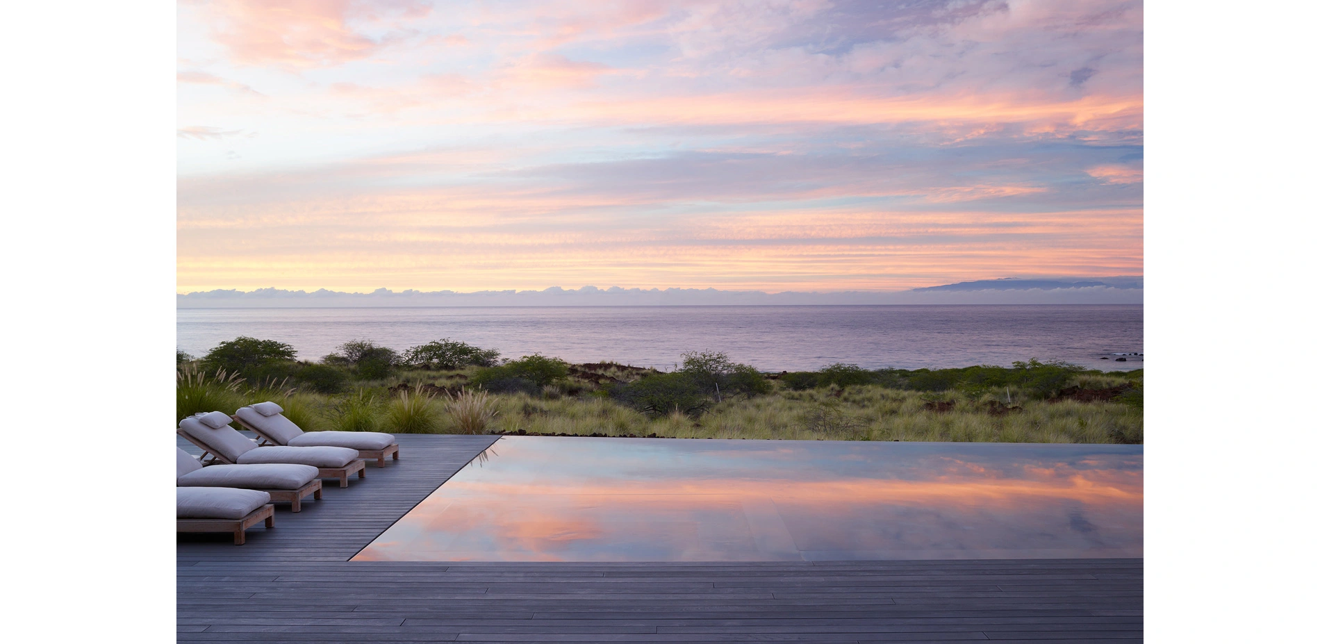 Rainfall is scarce on the lava beds of Hawaii’s dry Kona coast, with hardy wild shrubs and grasses clinging on to bare rock. The site was selected for its expansive ocean view with the island of Kaho‘olawe floating on the horizon. The clients imagined a calm and contemplative vacation retreat for their family and guests. The program called for a swimming pool, spaces to entertain, with a contemporary, minimalist approach to materials and planting.