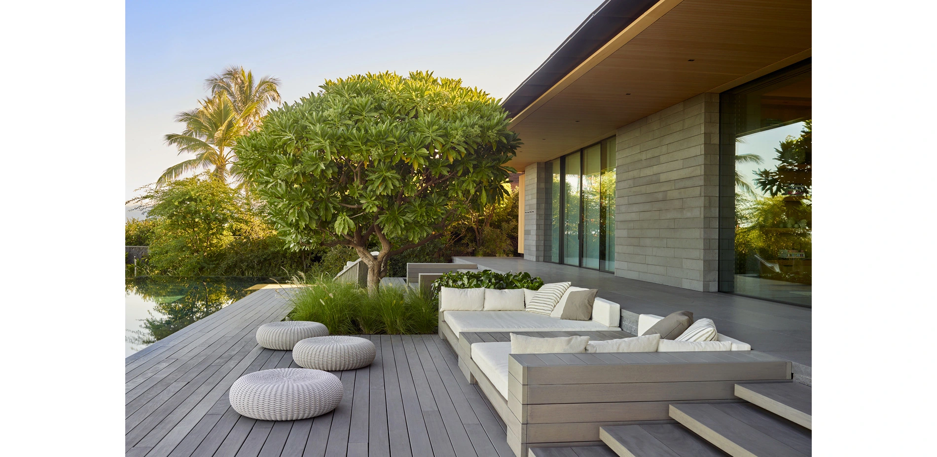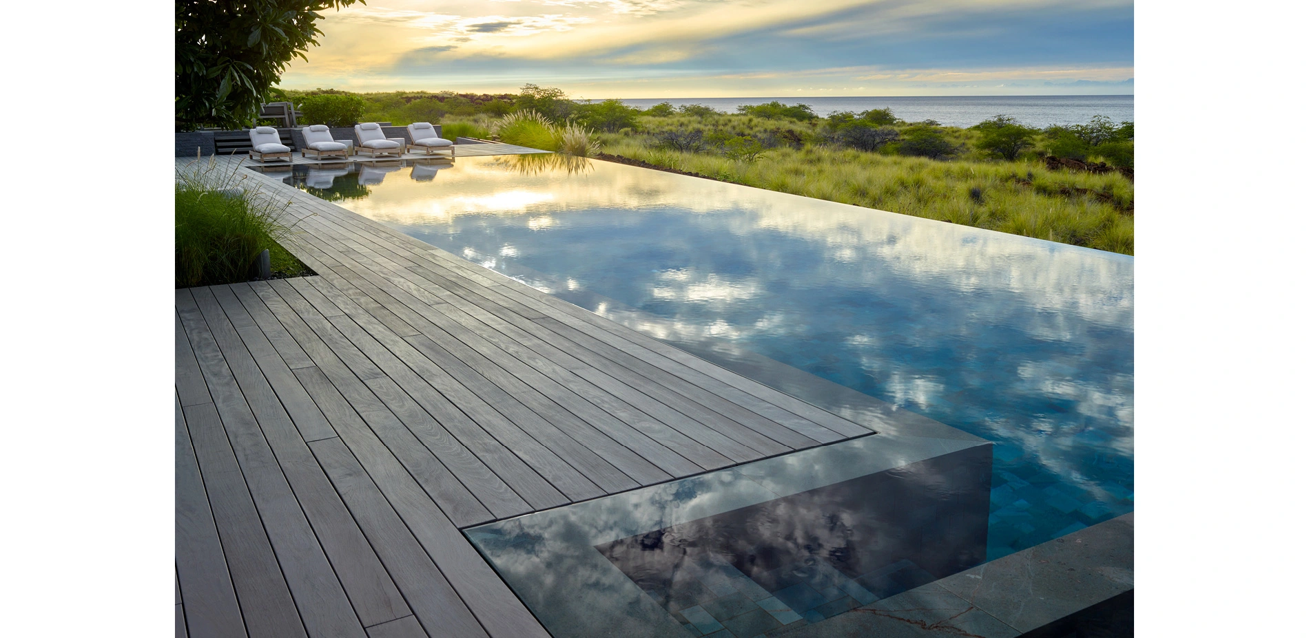 From the lush central courtyard, visitors gaze through the main hale’s sliding glass doors for a glimpse of the ocean. The living space opens onto a gracious deck with a negative edge pool that sits perfectly flush with the deck. The deck terrace, with built in furniture, planters and fire pit, provides ample space for the owners to dine, lounge, and play. The quiet minimalism of all these built-in elements serves to eliminate distractions from the expansive sense of space at the edge of the inhabited landscape. The visitor’s journey terminates at the pool deck with the merging of constructed pool and ocean. The pool’s far edge seems to disappear, creating a seamless connection to the vast ocean beyond, the final destination of water that travels through the site.