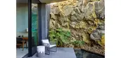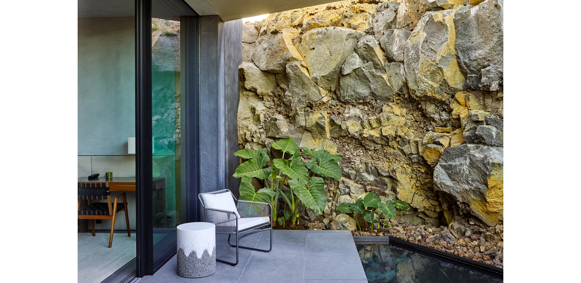 Materials were carefully chosen to serenely distill the colors and textures of this unique place. Basalt cobbles at the driveway contrast their simplicity with raw lava landforms. Slabs of lighter basalt make up floating steps and the plinth of the house, matching the building material and referencing the surrounding lava fields. Blonde gravel echoes the colors of wild grasses on the lava fields. Stone pool tiles were carefully selected to pick up the precise blue of the ocean.