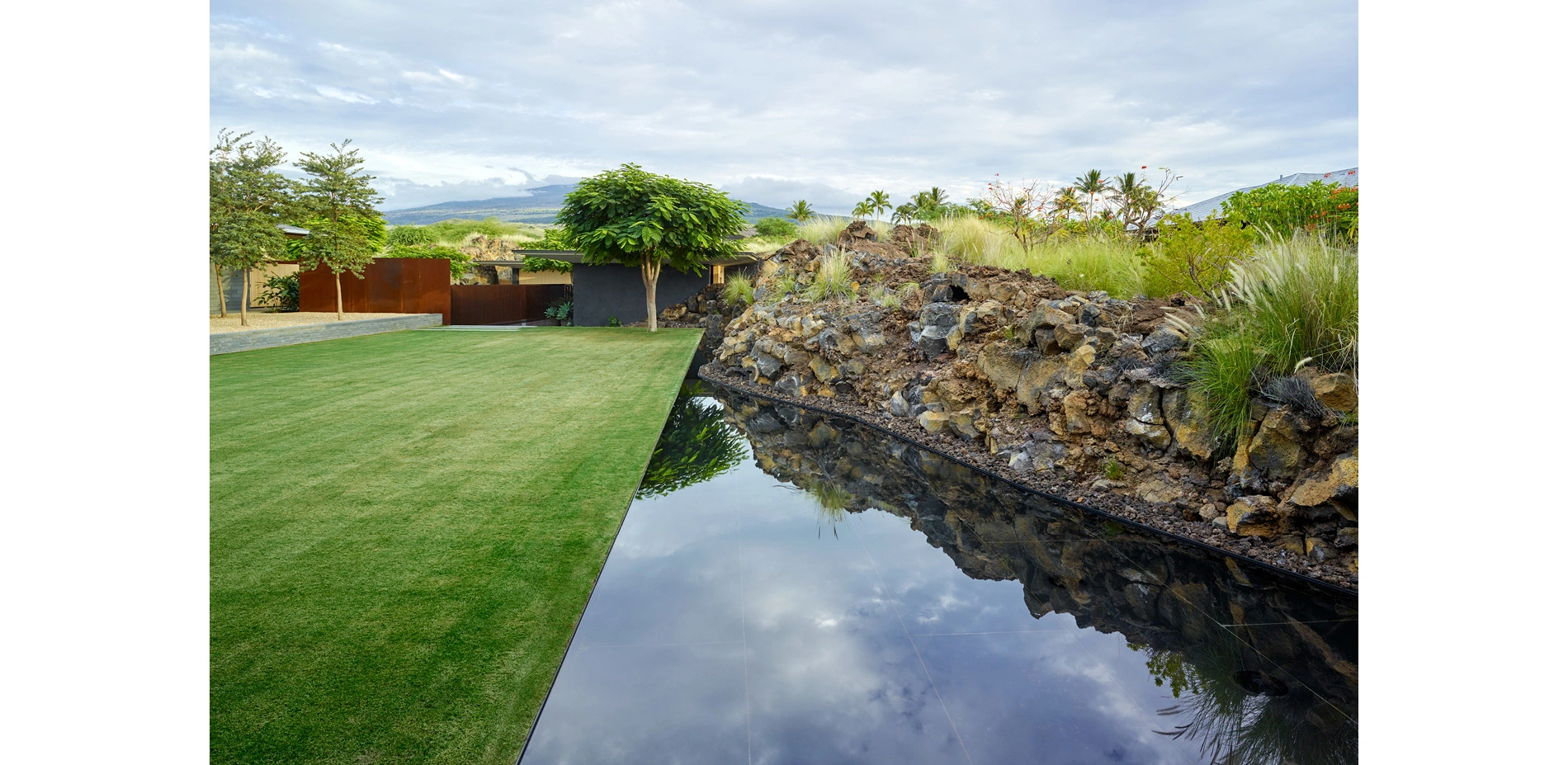 Beyond the autocourt, a series of reflecting pools offers respite from the harsh landscape, drawing visitors into an oasis-like space. This central courtyard, encompassing the living spaces, is built from the concept of an anchialine pond, where freshwater gathers in lava rock. The arid landscape falls away and the stone underfoot gives way to a springy lawn. To one side, reflecting pools enhance the sculptural characteristics of the natural lava as they emerge from the rock walls and spill into the courtyard. Two rows of tabebuia trees flank the other side of the lawn, echoing the airy refinement of the hale, or house.