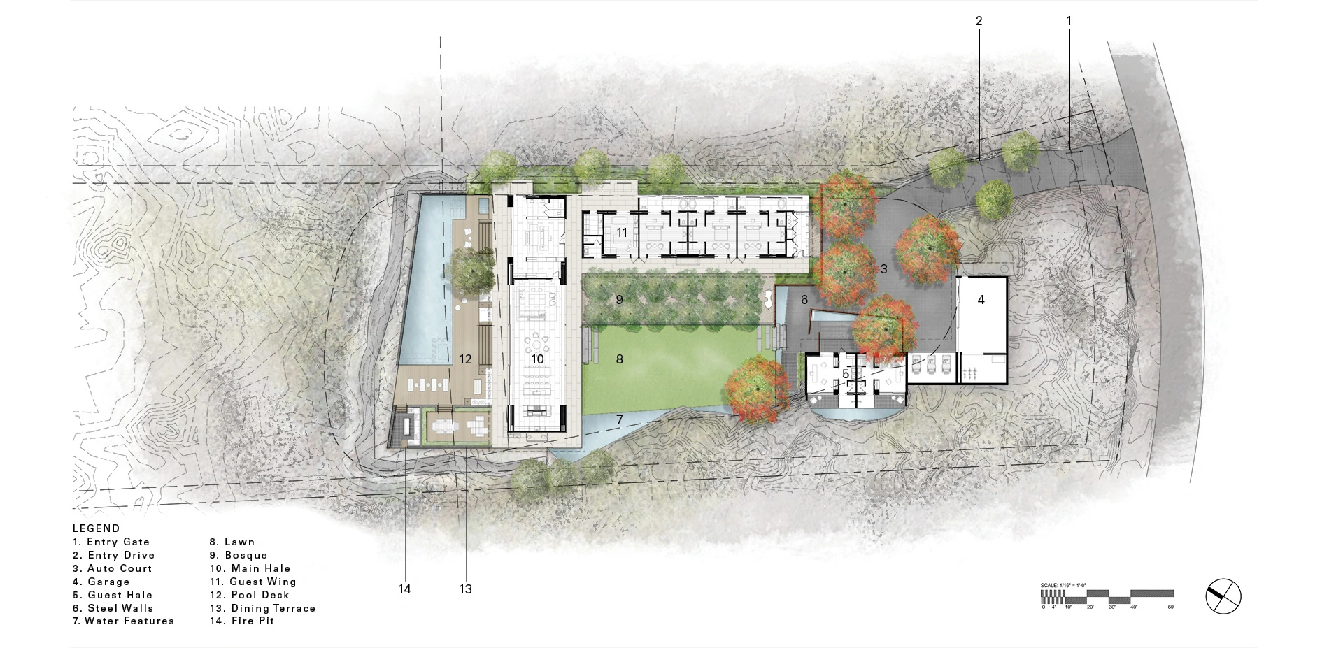 A third element of the native landscape that informed the design is the Anchialine pond, a fresh water source often found between mountains and ocean. In volcanic, tropical islands worldwide, water tends to seep through porous young lava bedrock and gather in pools at low elevations. Anchialine ponds historically provided fresh water for drinking and irrigation, as well as unique habitat for aquatic life. The landscape architect took inspiration from the mountains, the ocean and the lifegiving Anchialine ponds found along the aforementioned transect. Water and lava, drawn by gravity to the ocean, became the major guiding forces in the sequence of travel through the site.