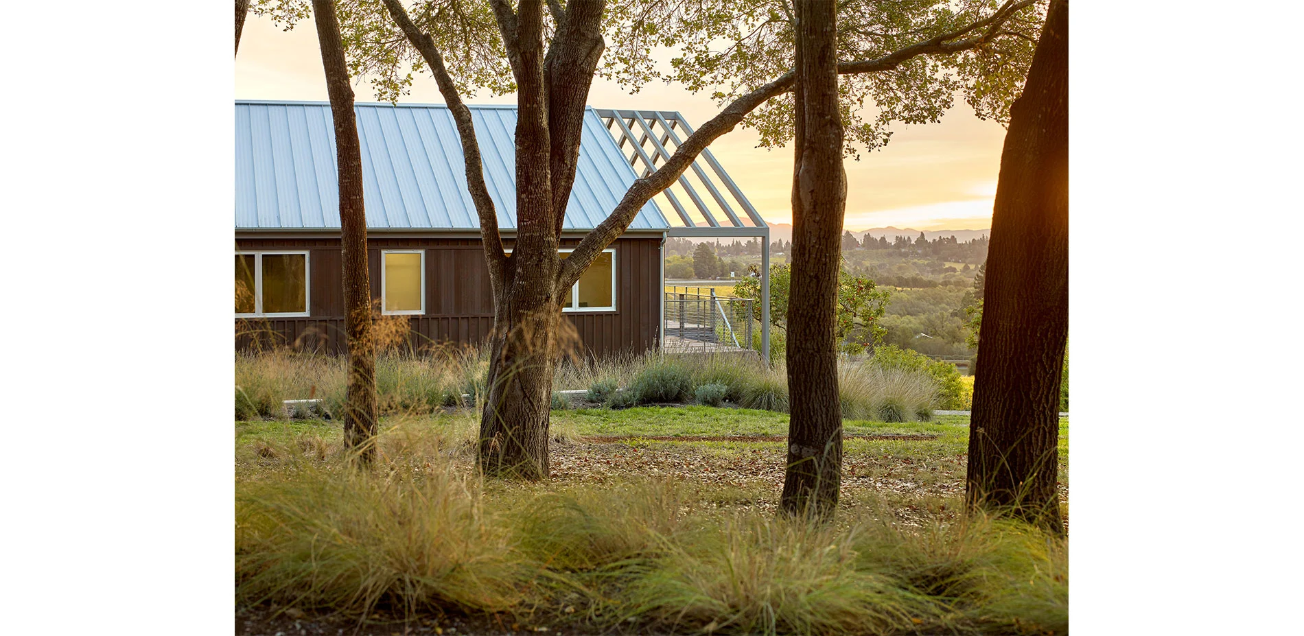 The three-acre site is at the intersection of coastal oak woodlands and cultivated fields of vineyards and Gravenstein apple orchards. The Gravenstein was the most widely grown crop in the small farming community of Sebastopol in Northern California during the early 20th century when much of the harvest was used for apple sauce and dried apples shipped to troops during WWII. Due to disease and lower yields, only a few orchards remain that have not been replaced by the more profitable grape growing. The house and an existing neglected Gravenstein apple orchard share the property with coastal live oaks that have gradually reclaimed the hedgerows and sections of the orchard that died. Where the apple trees have succumbed to the oaks, the design allows the oaks to reclaim their natural habitat. In areas where the fruit trees are still healthy, the agricultural history of apple cultivation is preserved by restoring portions of the orchard with new trees.