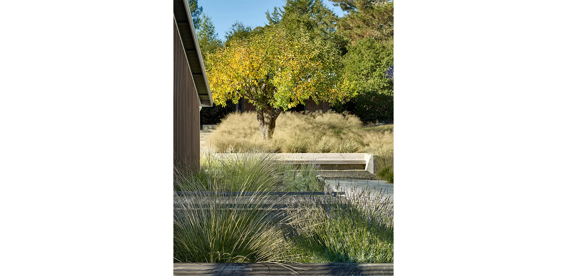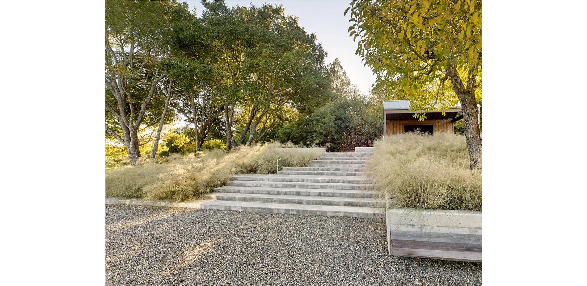 The open landscape and spectacular views dictate a design that intervenes with subtlety. The introduction of simple forms and the use of vernacular materials are used as means to appreciate the natural beauty and history of the site. Upon entering the property, the concrete steps, board formed concrete, gravel courtyards, and a wood bench recall the utilitarian materials that are typical in the farming community. The orthogonal concrete platforms focus the attention on the vineyards in the distance while highlighting the delicate textures and patterns of lights and shadows of the native grasses. The “arms” that extend from either side of the house to the pool decking and gravel walk to the vegetable gardens define the region where the farmed and gridded patterns of the vineyards and orchard meet the less controlled landscape consisting of live oaks and California fescue. A wood bridge spans a stretch of deer grass before entering the house at the front and side yards. The concrete walk engages the distant landscape and connects the entry courtyard to the rear deck and terminates with wood steps to the orchard below.
