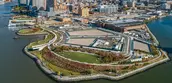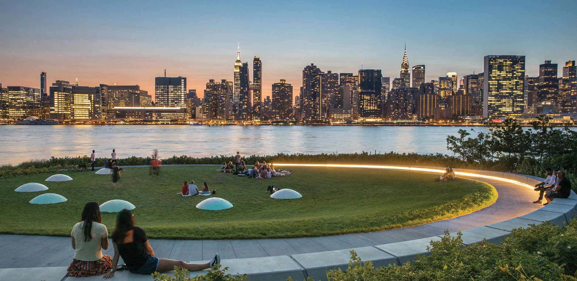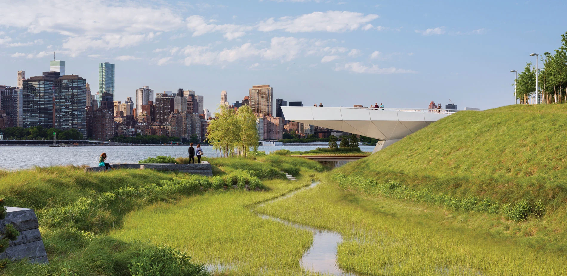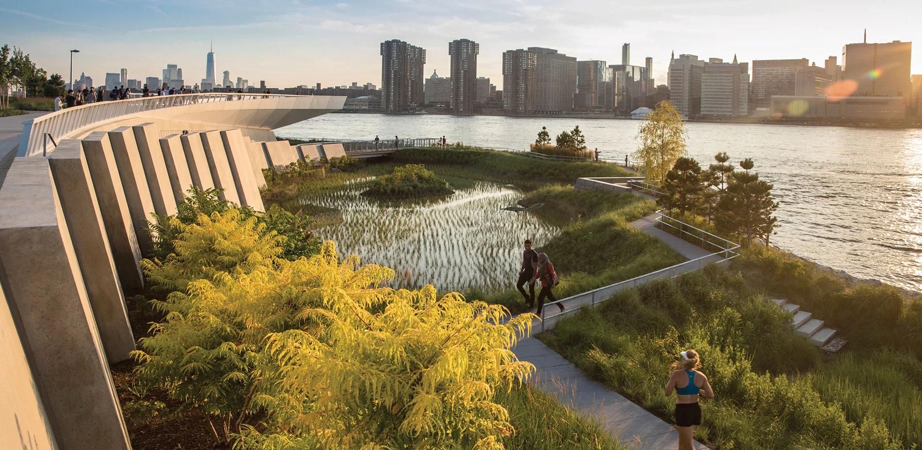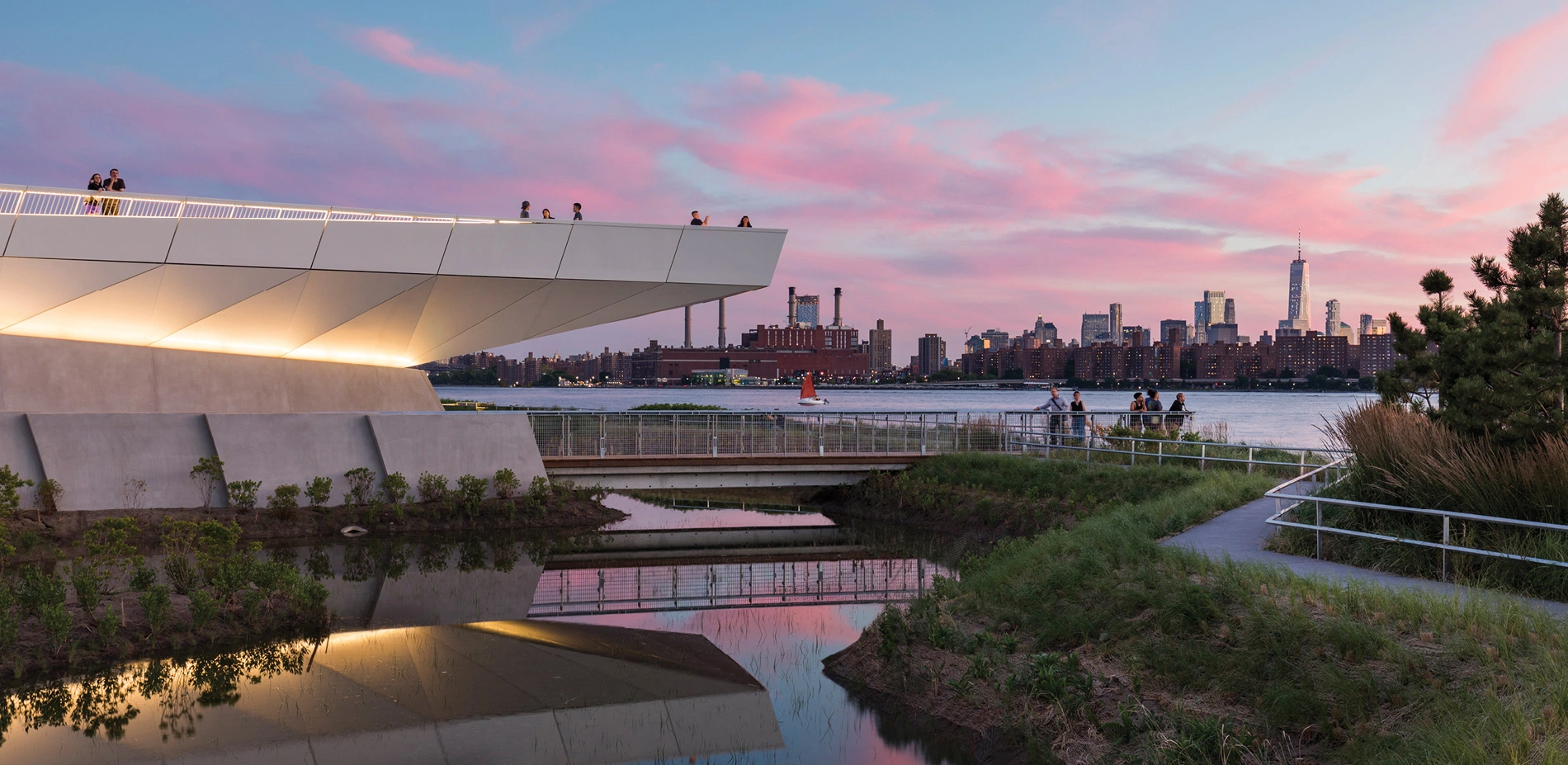 The design embraces its diverse heritage with a "soft" approach to floodwater defense, leveraging the site's topography with a sculpture grassland park which boasts a dramatic cantilevered overlook, sunset promontory, island sanctuary, and unique tidal marsh with trails that meander in the shadow of Manhattan. A resilient, multi-layered recreational and cultural destination, Hunter's Point South Waterfront Park Phase II brings the city to the park and the park to the waterfront.