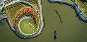 A new tidal habitat marsh has also been carved behind the smaller landfill peninsula to "release" it from land, creating New York's newest island which is accessed only by footbridge and an arcing path sprung from the first phase green oval. Sheltered from the mainland world with a crescent-shaped berm and a black gum grove with understory plantings, this unique island sanctuary hosts intimate gatherings and "Luminescence", a public art installation by Nobuho Nagasawa, which interprets the site's tidal influence and the moon's seven stages with luminescent mineral applied to the spheres.