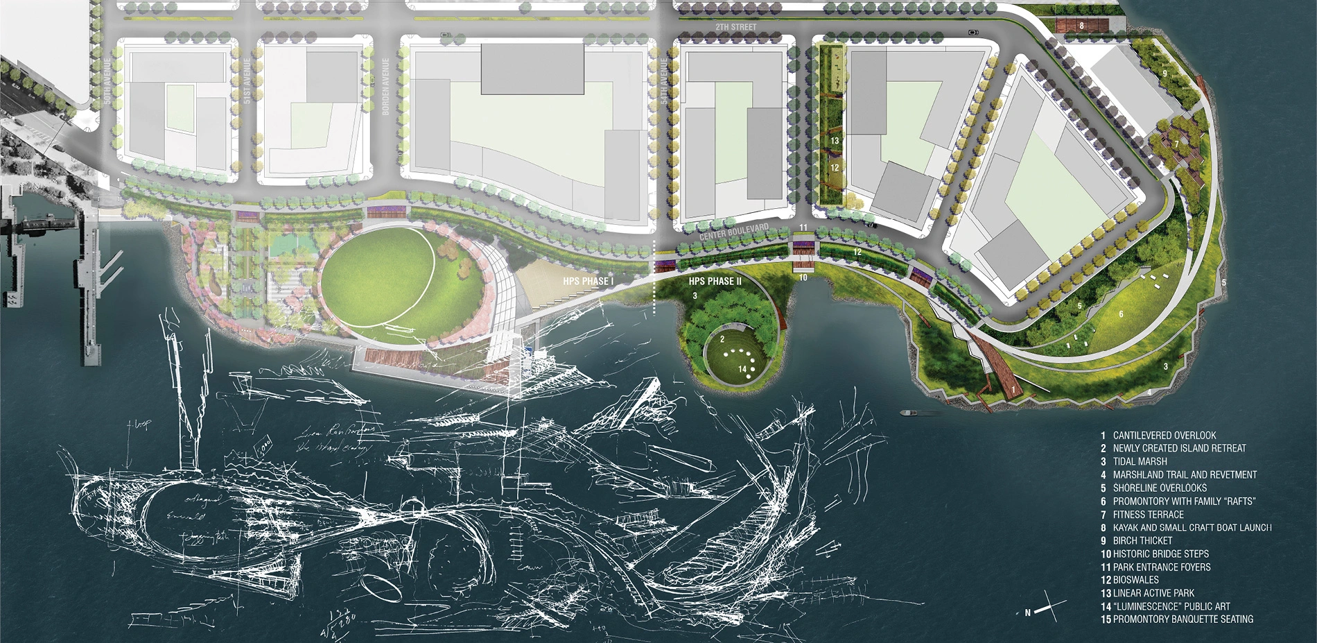 Extensive community outreach and dialogue led to a consensus program that was revisited at the onset of this final phase. At its core was a strong desire for this park to be the shared ground for an existing and new community of diverse ages, interests, and culture; with a balance of passive and recreational opportunities that could be found within an environmentally enriched riverain setting. Being a level existing bulkheaded site, the earlier phase was envisioned as a vibrant community gathering space, park and ferry pavilion, pier, play areas, dog runs, bikeways and beach as well as a multi-purpose lawn and richly planted bioswales to catch, filter, and release flood waters.