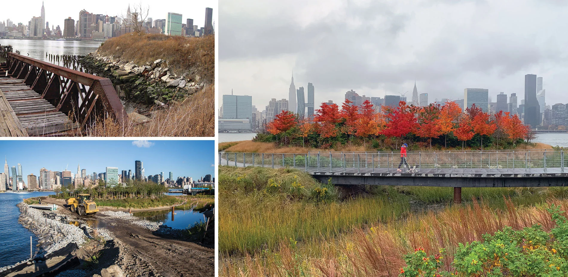 Started in 2008, the first phase was completed in 2012 with this, the final phase, opening to the public in 2018. The design re-establishes the site's former marshland identity and introduces a resilient, multi-layered recreational and cultural destination that connects its changing community to nature, the river, and each other. The collaborative team of landscape architects, architects, and green engineers employed innovative and flexible strategies that were tested as Hurricane Sandy battered the shore and are now held up as models for progressive resiliency design. It has received the highest WEDG certification of all NYC parks.