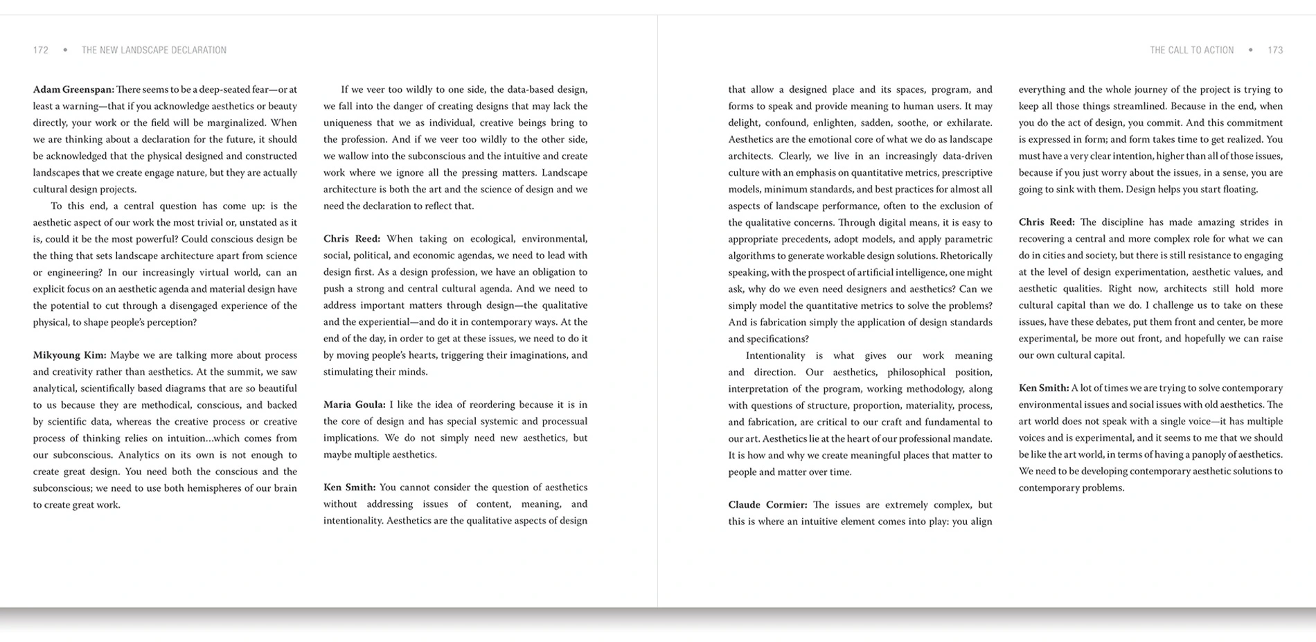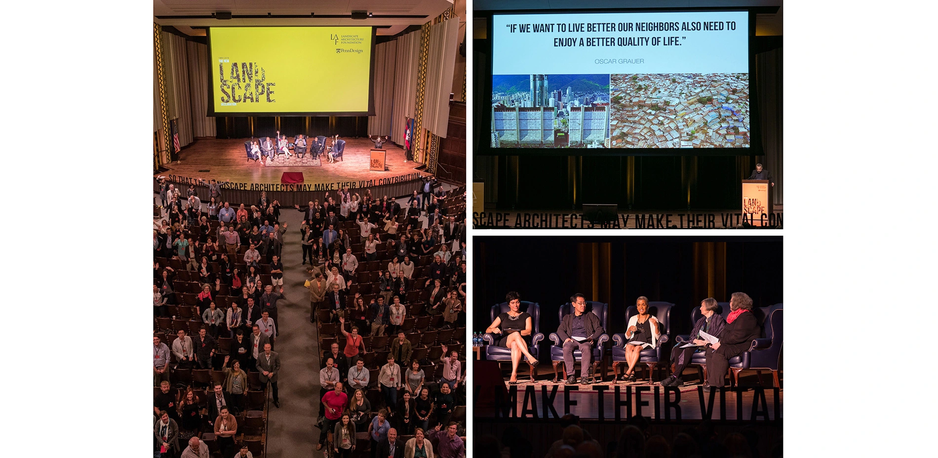 In preparation, LAF asked a diverse group of leading minds in contemporary landscape architecture to write their own "declarations," reflecting on the last half century and offering bold ideas for what the discipline should achieve in the future. These new declarations were presented at the summit. The following day, nine panels, curated by theme, responded to the declarations and engaged in lively debate about how to realize landscape architecture's potential and effect real-world change. LAF then synthesized the values, discussions, and ideas from the summit to create a new manifesto for landscape architecture.
