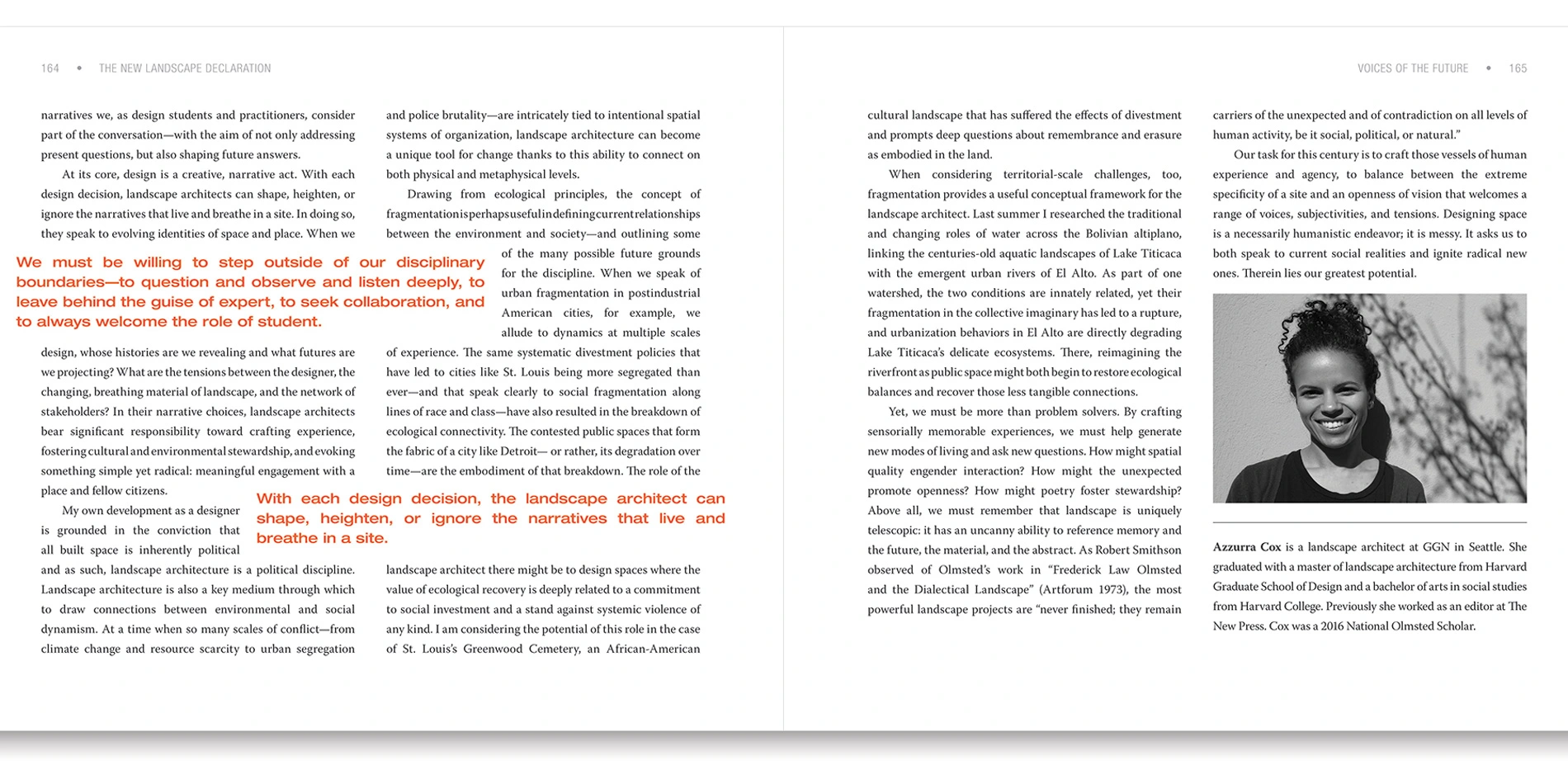 The New Landscape Declaration offers a unique opportunity for landscape architects to step back from their day-to-day work, affirm values, and think big. The book asserts the essential role of landscape architecture in solving the defining issues of our time: climate change, species extinction, rapid urbanization, and inequity. The recommendations are relevant to designers across the globe, underscoring the need to diversify, innovate, and create a bold culture of leadership, advocacy, and activism.