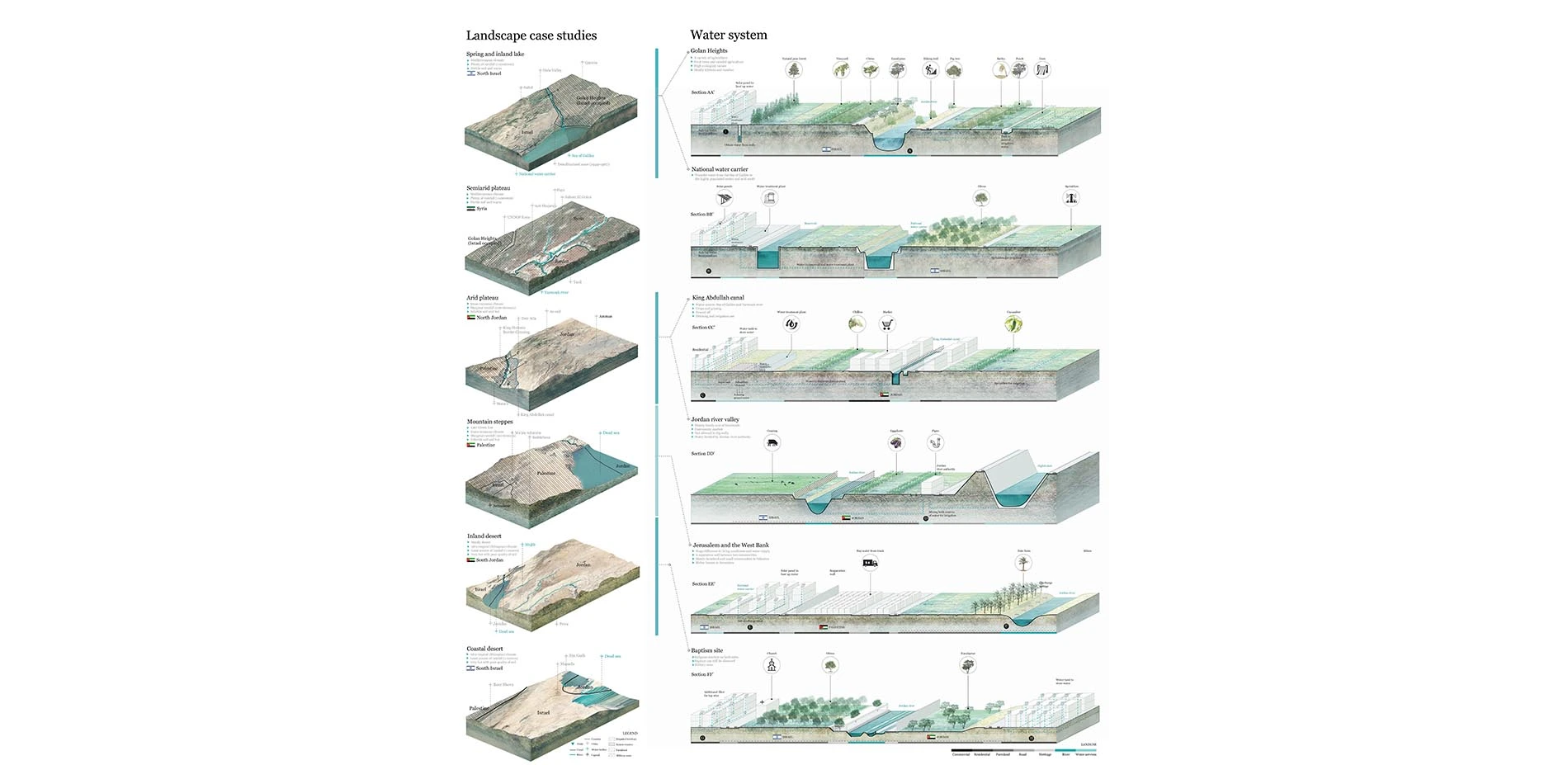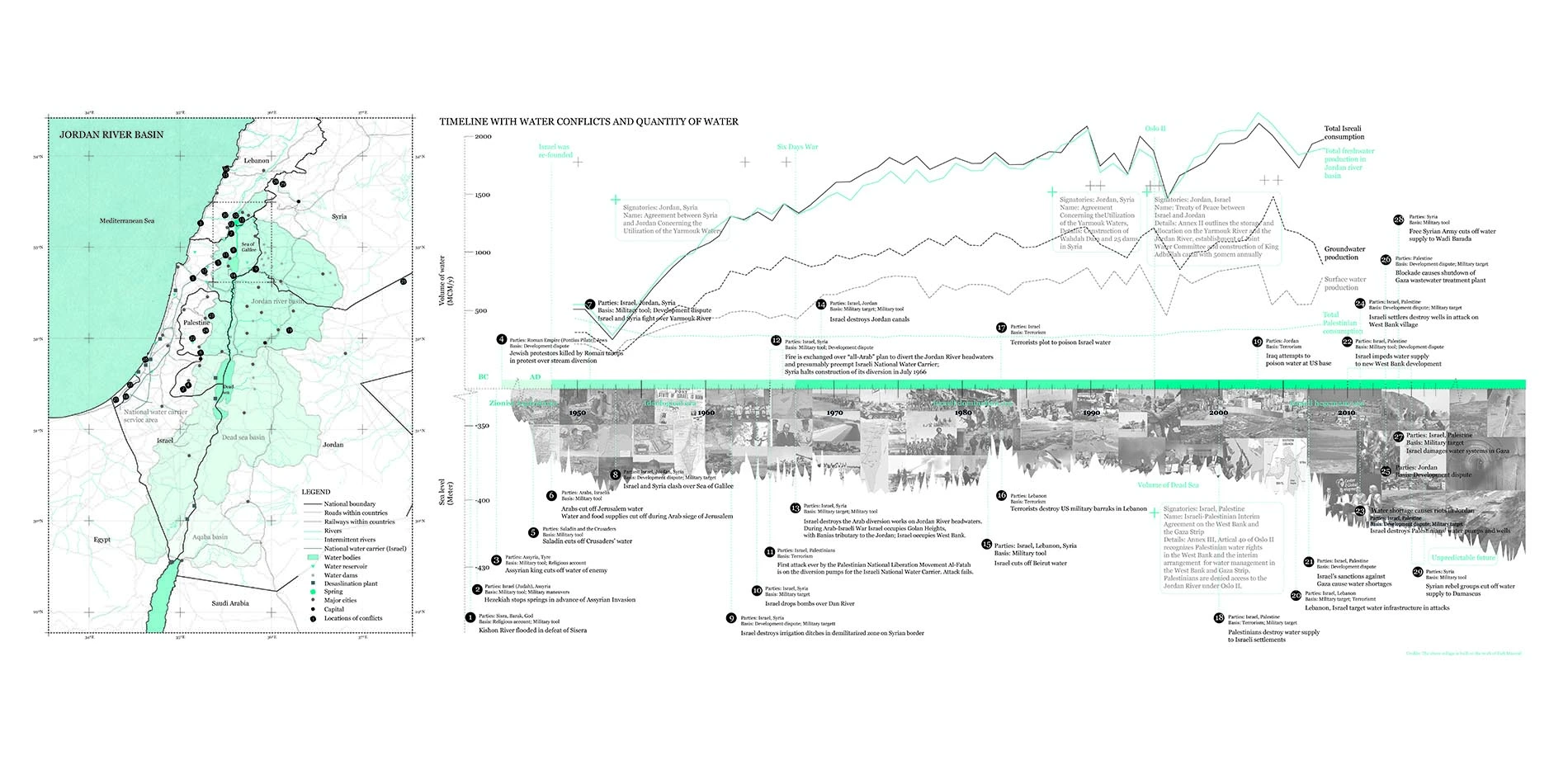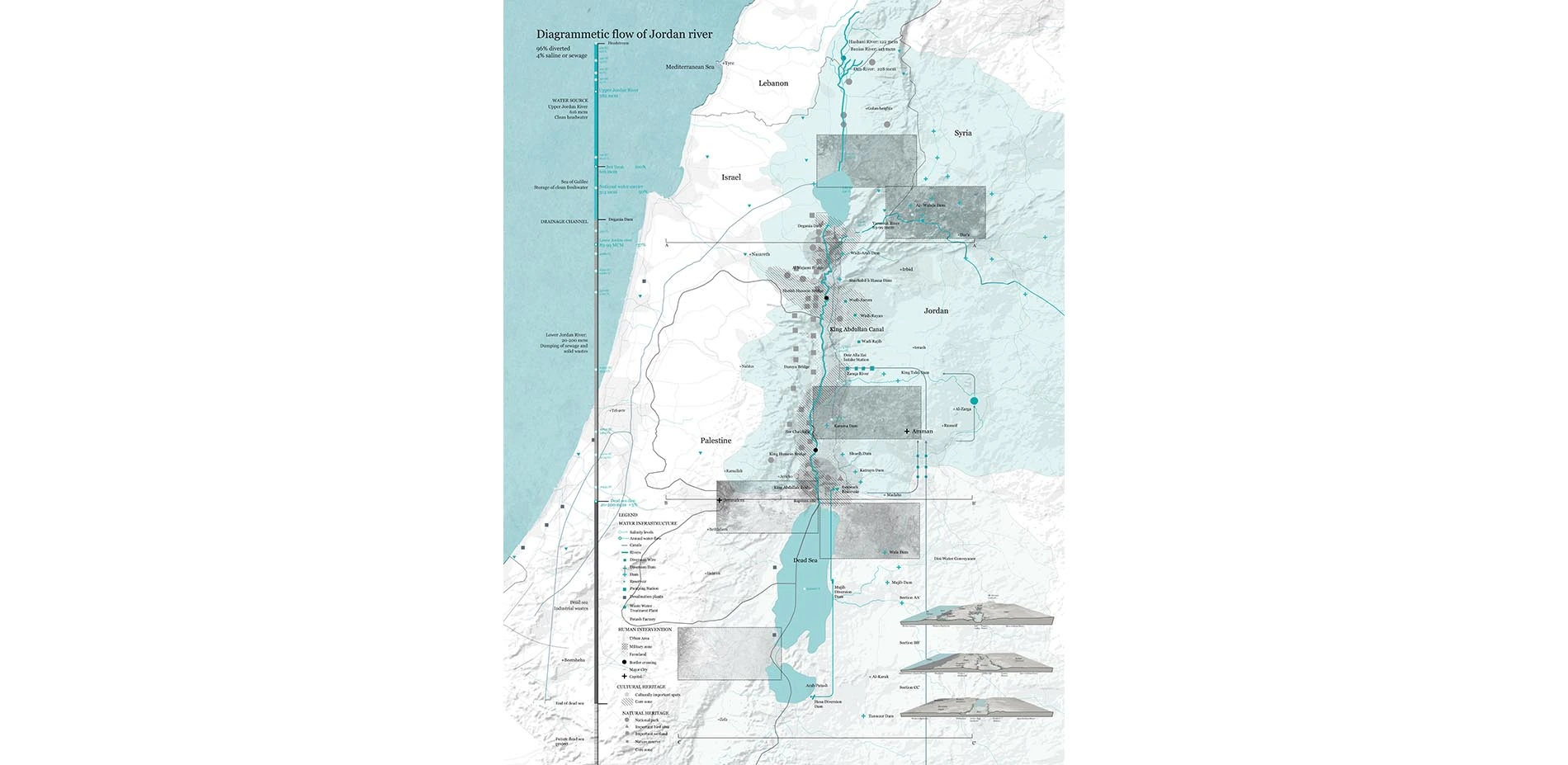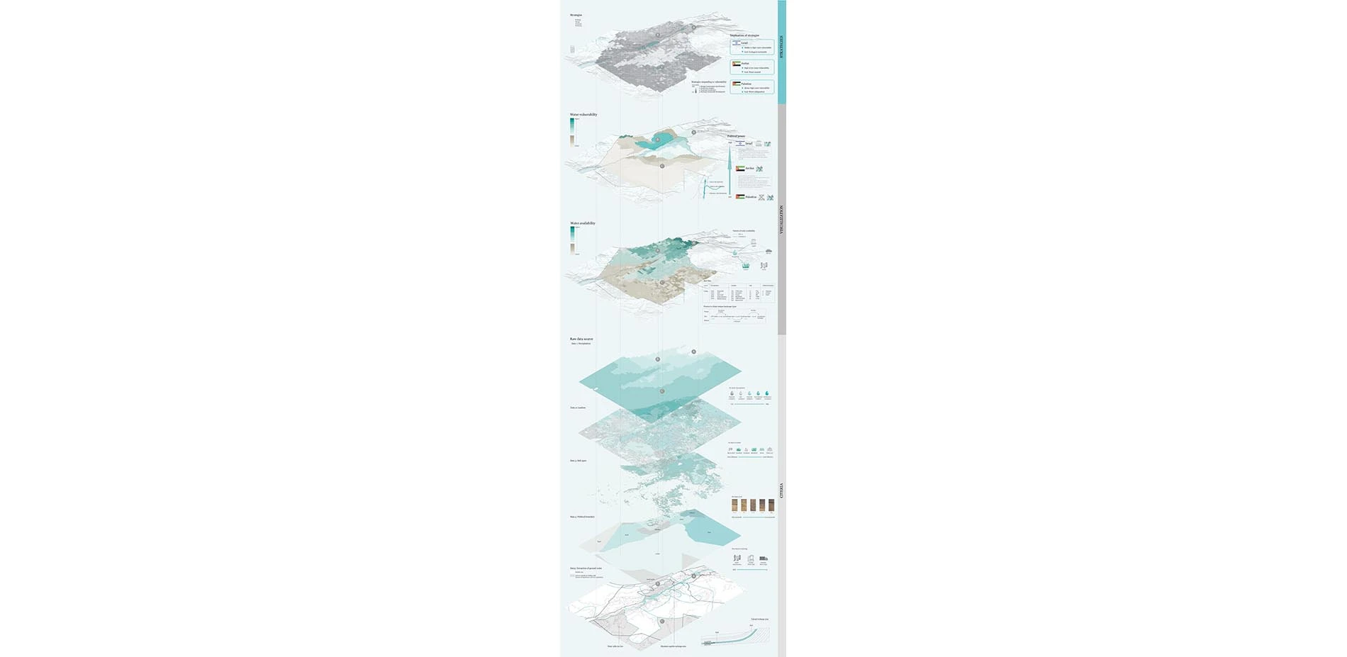 The research visualizes the entire Jordan River Basin to explore how systems of access, diversion, usage and treatment of different locations in the basin are affected by water politics - in the form of treaties and political decisions. The way in which communities utilize water for their daily lives and agricultural activities relies mainly on a centrally controlled supply.