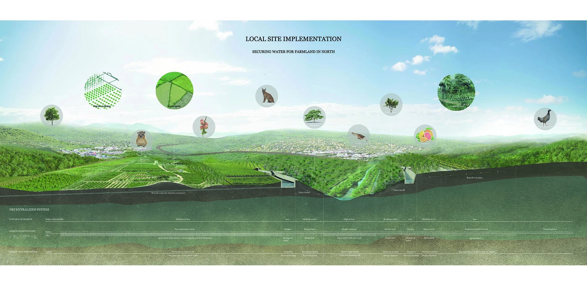 The design process exemplifies an evidence-based design process that enables an inclusive and participatory actions from across societies and nations. The project developed a geospatial model to identify and quantify the potential for conserving, storing, treating, producing water and recharging aquifers strategically. This model is a visualization tool that uses a multi-criteria decision-making analysis to identify the most suitable areas for the above functions. Outputs from this analysis inform a regional water management proposal.