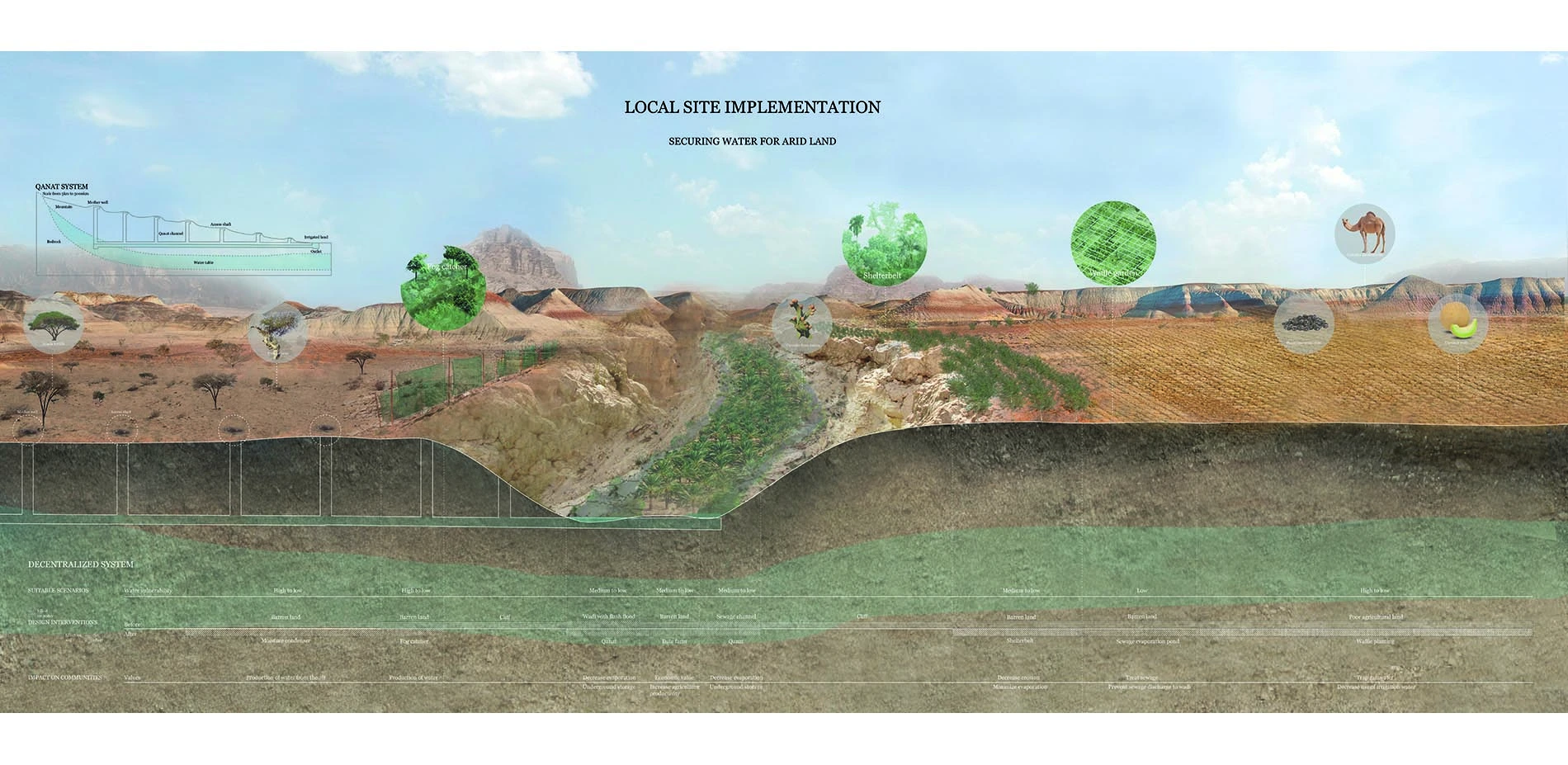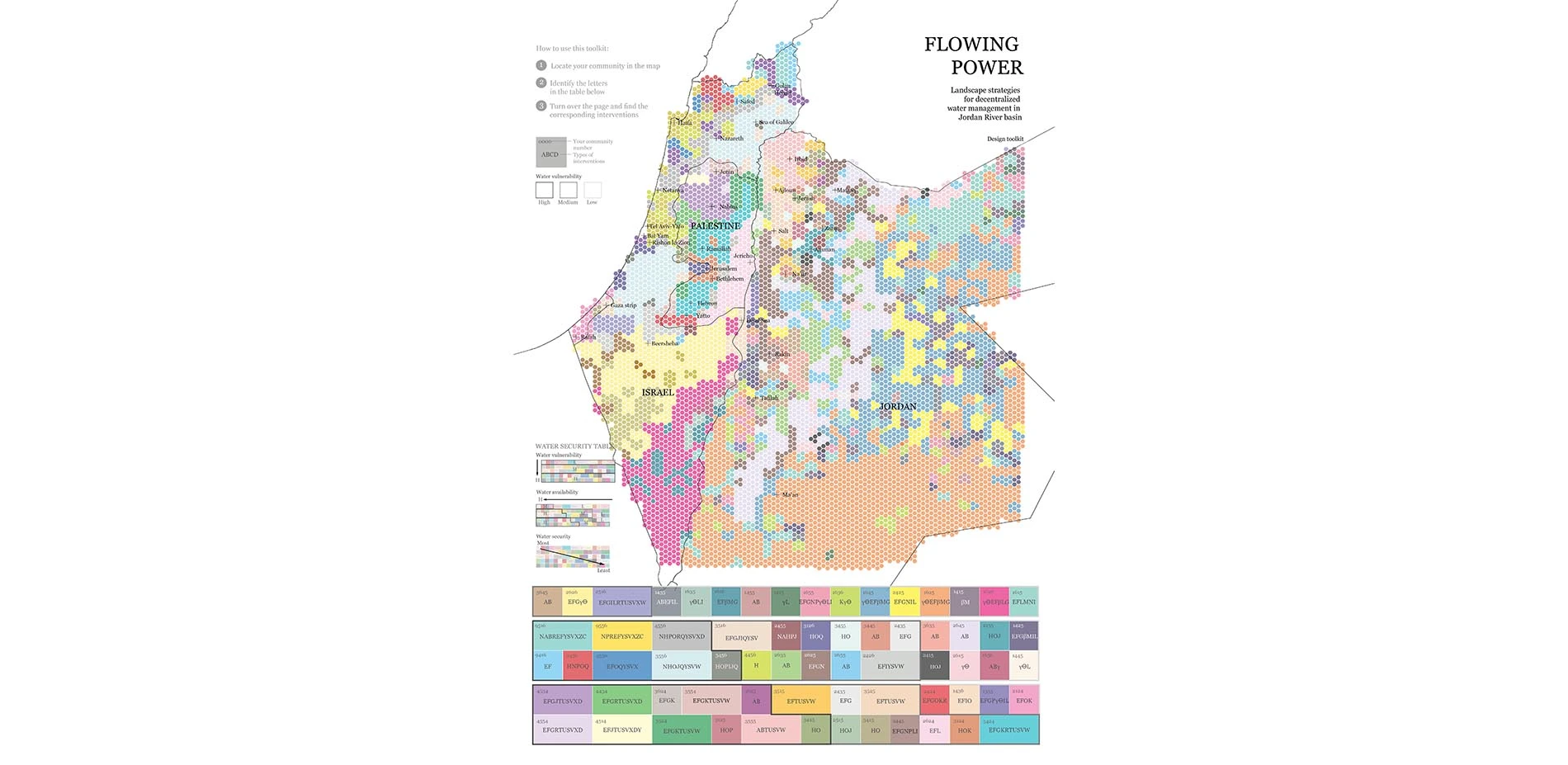 The project proposes a new design framework that enables a new strategic plan for a decentralized system to achieve water security at the community level and conflict resolution at the regional level. It offers a viable alternative to the current centralized water management system and proposes to assert water security as a critical role in achieving political stability. Navigating between the geopolitical system and landscape features within the shared river basin, the project enables community capacity building to attain water security.