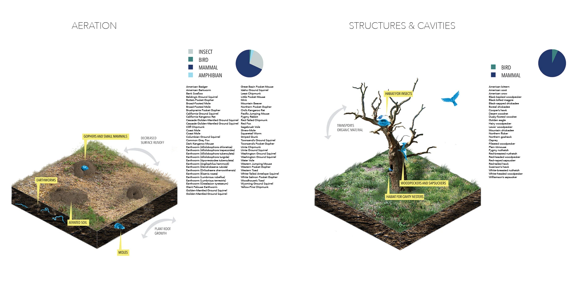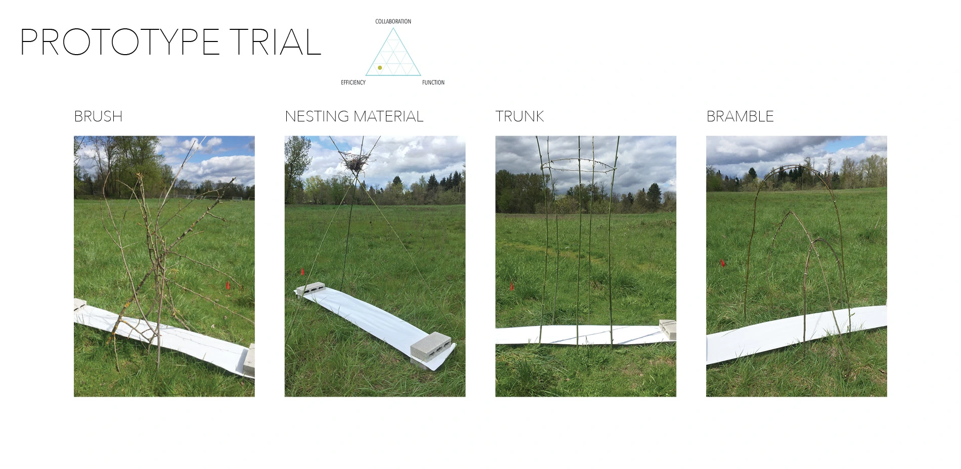 The framework I developed in this project guides designers to create site-specific interventions that restore ecological structure and function. The framework starts with a particular site where the designer defines their goals based on historical conditions, reference landscapes or preference. The designer identifies the landscape needs and chooses from the list of animal functions that are available at the site to address them. Design interventions are explored through phases of prototypes to encourage that function. The process begins with model prototypes to determine efficiency with cost and energy. Feasible designs are tested with full size prototypes at the site and observed for meeting the criteria for success: collaborative, functional and efficient. Each phase of prototypes is informed by the animal and site response to refine and strengthen the design.