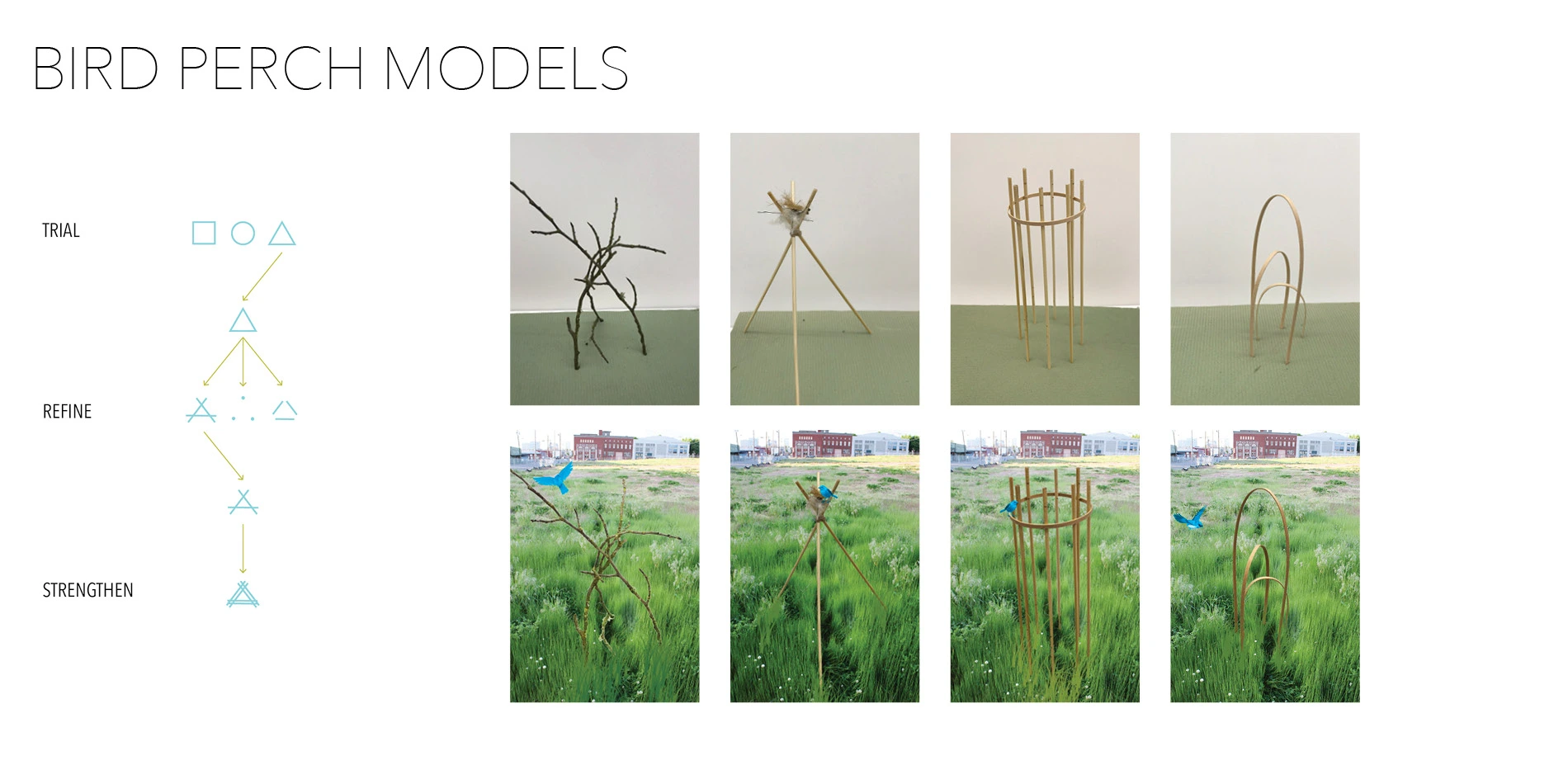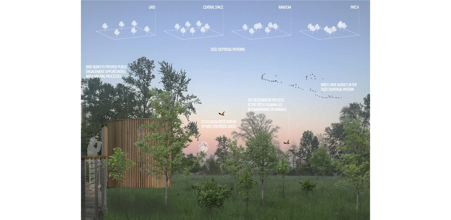 Contextual analysis must be conducted for each site, including an assessment of dominant animal actors. The species inhabiting or proximate to a site determine the possible design intervention. For seed dispersal on the site in Oregon, birds are the more abundant animal actors and confirmed dominant animal available on the site. To encourage seed dispersal, I test various perch designs that will encourage birds to disperse seeds from surrounding areas. The prototype models are inspired by bird perching behavior. One provides tree limbs as a naturalistic option, the second provides an incentive with nesting materials, the third provides different directions for perching, and the fourth provides varying heights.