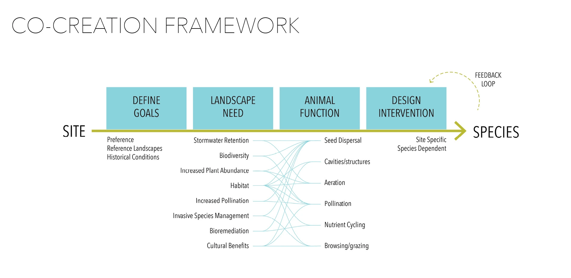 This research explores the potential for co-creation between animals and designers to restore ecological function to underperforming landscapes. Co-creation, in this case, is where animals participate in the design process in ways that are collaborative, functional and efficient. Findings suggest that designers may co-create landscapes with animals by harnessing functions like seed dispersal, pollination, soil aeration, construction of habitat structures, nutrient cycling, browsing and grazing, wood fragmentation, water filtration and damming. This research proposes a framework for co-creation with specific animal functions and outlines a process for prototype design intervention that is transferable to local restoration efforts. Prototype bird perches that encourage seed dispersal test this framework on a neglected site in Eugene, Oregon. The site and resident birds respond to the perches, producing a feedback loop that informs a succession of prototypes. The resulting designs are tailored to each site and produce cost-effective, suitable, and non-human-imposed outcomes.
