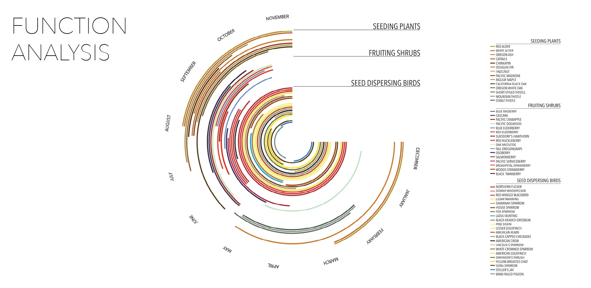 I tested this framework with a site on the University of Oregon campus that is representative of a vacant lot. I tested the seed dispersal animal function because it addresses most of the landscape needs in a vacant lot such as stormwater management, biodiversity, plant abundance, habitat, pollination, bioremediation and cultural benefits.