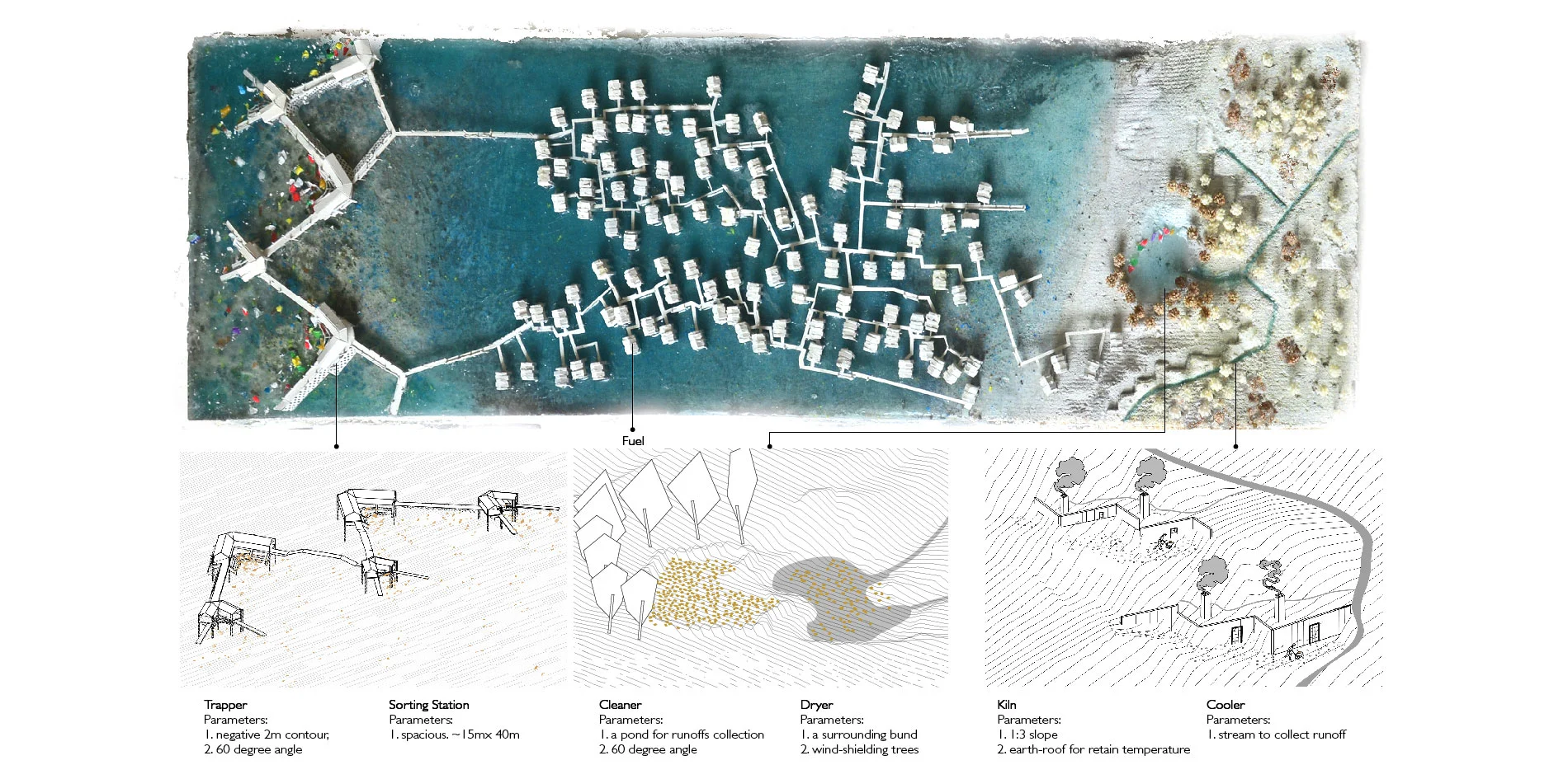 The submission intends to revert the situation by empowering the indigenous villages, designing devices and structures to incentivize spontaneous plastic recycle. Through a recent innovation in crafting plastics, the submission proposes that the plastic tides can be mined, shredded, cleaned, dried, baked and cooled in an efficient landscape system.