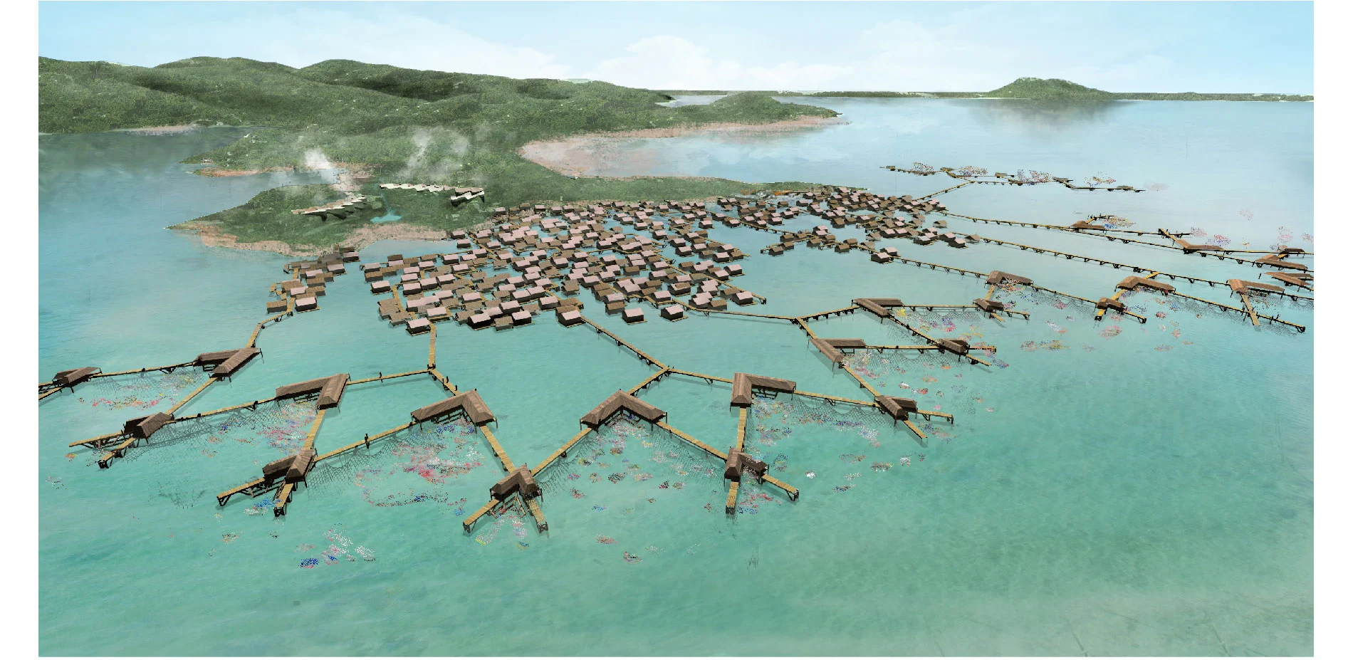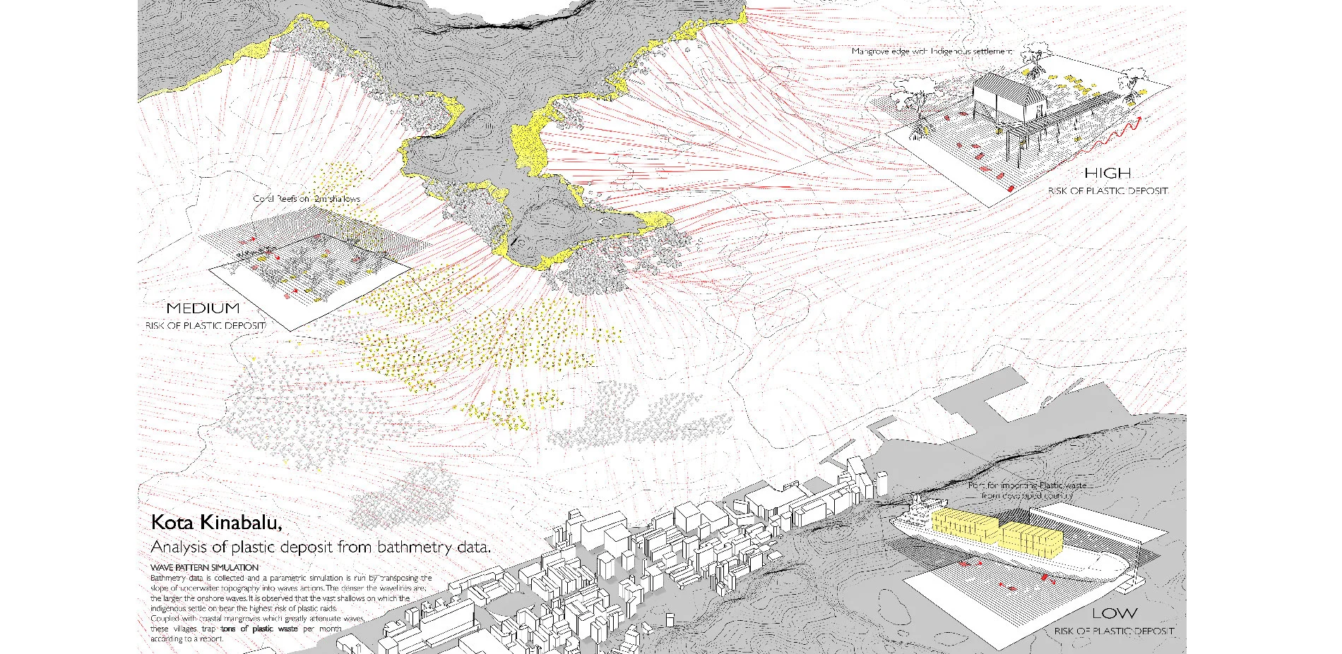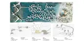This conceptual plan envisions a landscape solution to the dire problem of ocean-borne plastic waste washing ashore in coastal communities in Southeast Asia. Three-quarters of all plastic waste polluting the world’s oceans originates in Asia, with large amounts of this Plastic Tide damaging remote kampong water villages, especially those built on shallows or beachfronts. The proposal suggests a clever, low-tech solution that allows these settlements to mimic industrial recycling facilities by “mining” the plastic waste that pollutes their communities and processing it into an economically viable form. This is an extraordinary example of environmental adaptation that redefines the meaning of landscape intervention and sensitively confronts an issue of growing importance around the world.