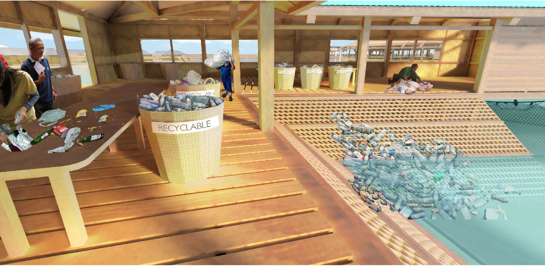 The design thesis proposes a solution that relies on simpler technologies, with the inclusion of the waste pickers who reside in the water villages. The community is heavily raided by the plastic tides, so they not only have ample reasons to collect the waste, but also the ability to own these operations.