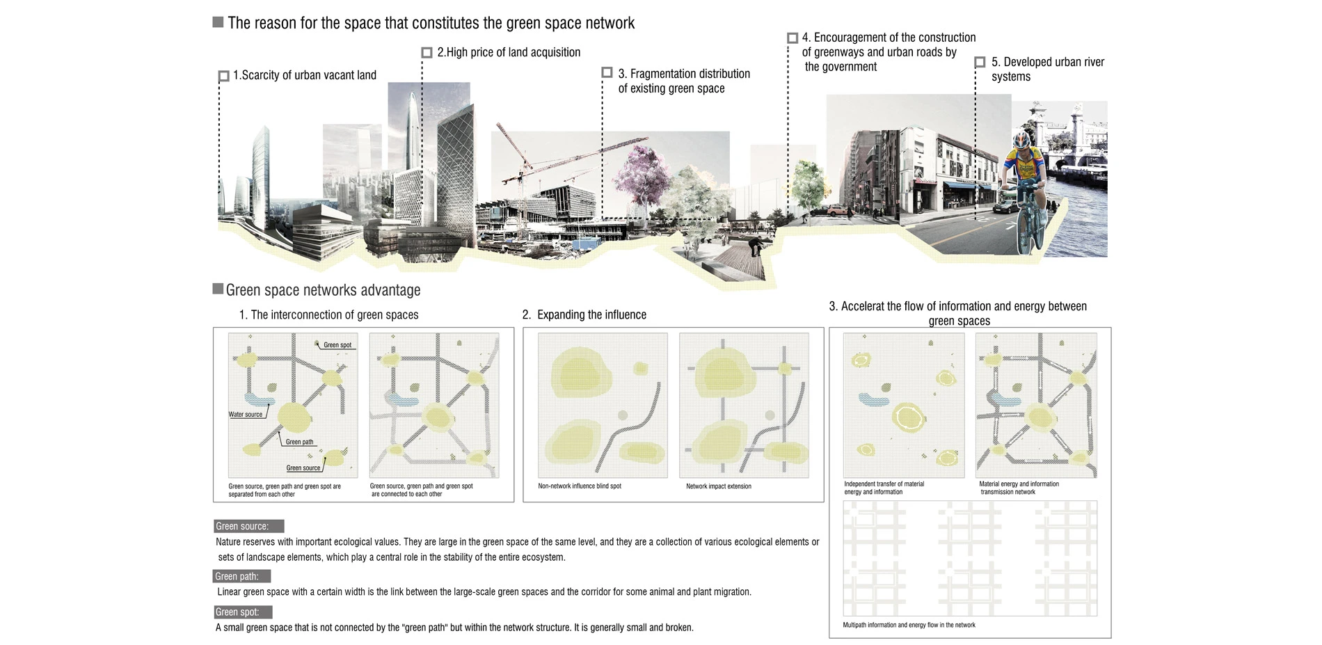 Therefore, combined with the status of urban land use, the pattern of green space fragmentation, the portability of the street, and the advantages of networked systems, it is found that connecting the city green space through the green trail is an ideal way to grow the urban green space.