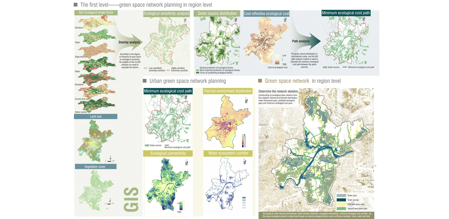 Based on the natural ecological factors such as mountain, forest, water and field in Wuhan and the land acquisition price, the GIS superposition analysis is used to construct the minimum cost path migration of biological migration, and the green corridor connects a large area of urban green space to form a green space network.