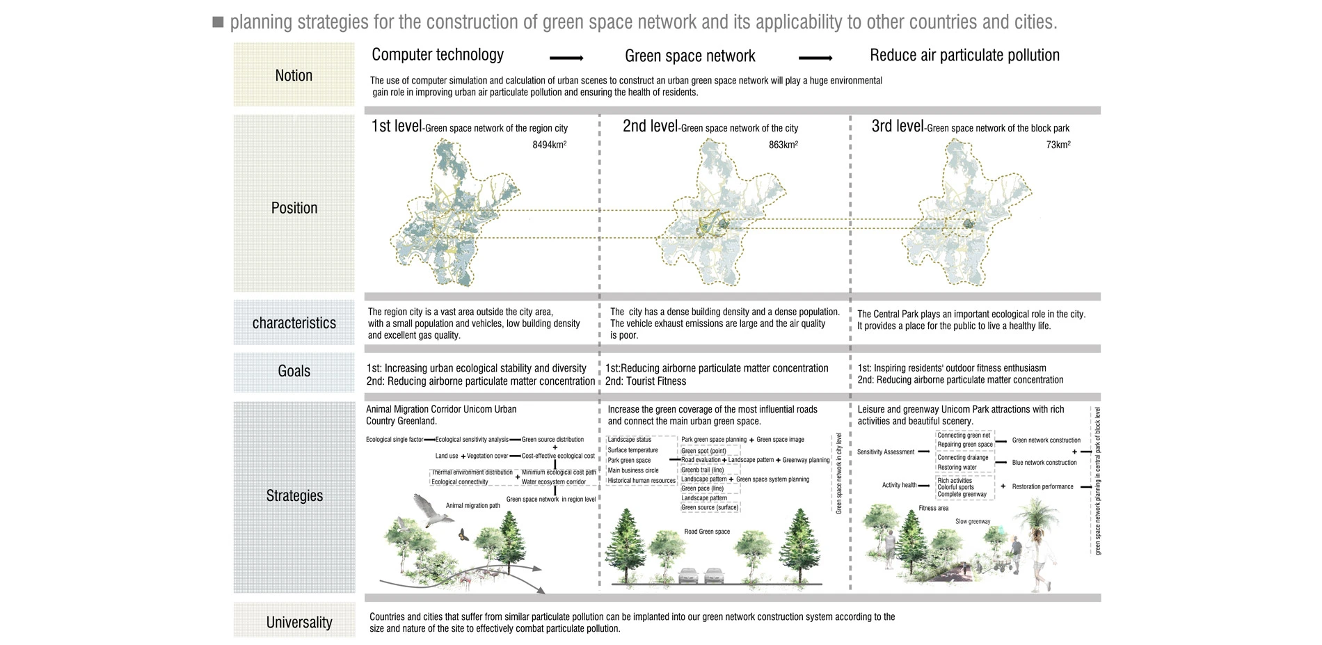 Green space network planning is a complex and technical planning project. It reasonably increases the urban green space area in cities with high building density and large population, and actively plays a role in reducing the concentration of urban airborne particles. At the same time, the green space network also has significant gains in maintaining urban ecological stability, increasing ecological diversity, and beautifying the urban human settlement environment. The urban problems faced by developing countries around the world are highly similar, such as urban land scarcity, population concentration, air pollution, etc. The methods and technologies of green space network planning are based on urban common problems, which are generally applicable to other cities. We hope to improve the poor air environment of developing countries and cities through green space network planning, so that air pollution will no longer harm the poor.