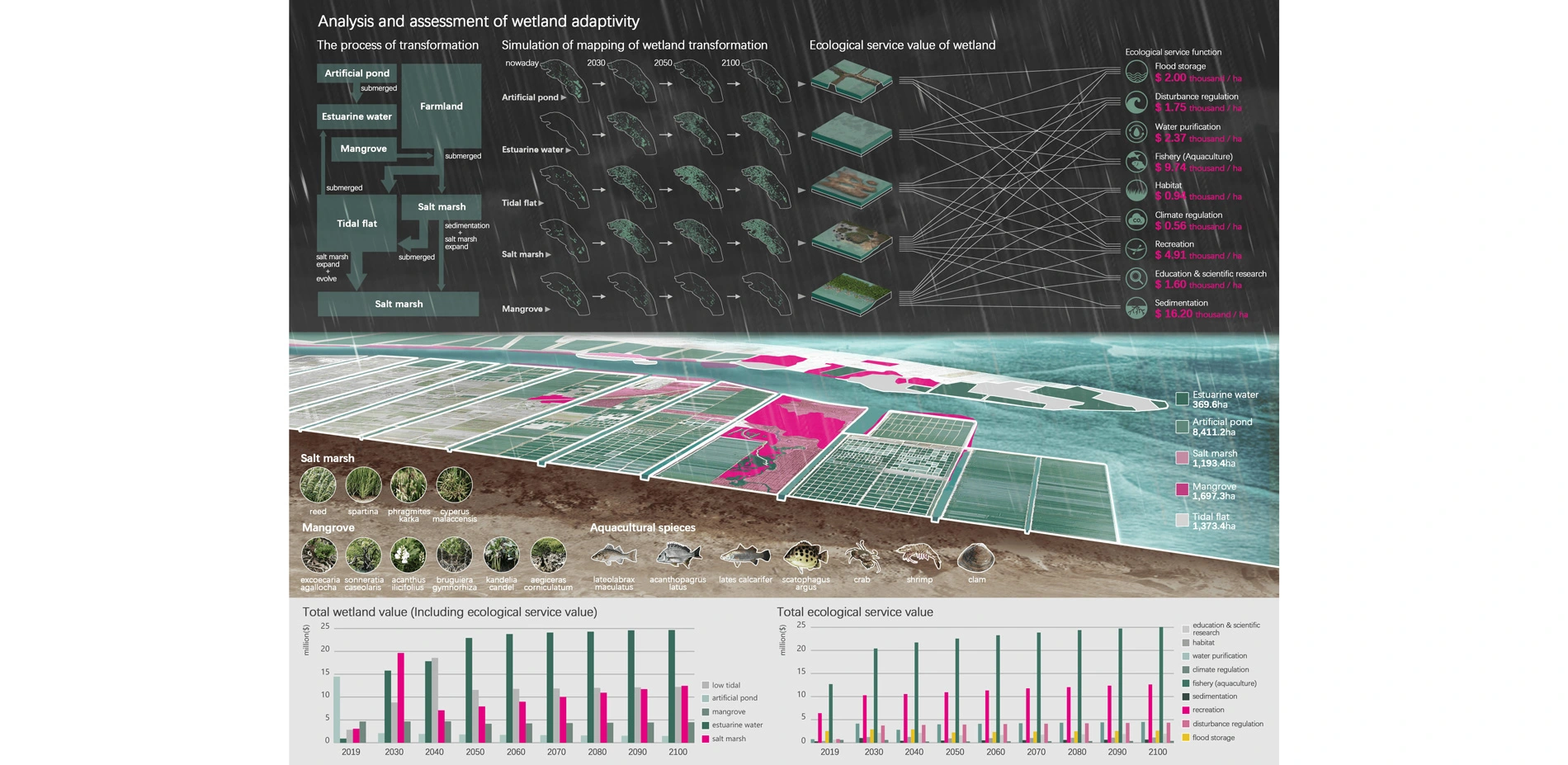As an artificial landscape, coastal agriculture landscape in Guangzhou spatially overlap within parts of wetland—ponds and tidal flat. Therefore, agriculture and wetland should be regarded as a complex landscape system. Based on multiple indexes of economic value, this design focuses on assessing agricultural vulnerability and wetland adaptivity, and simultaneously taking the dynamic impact of SLR on the landscape system and the succession of wetland into consideration.