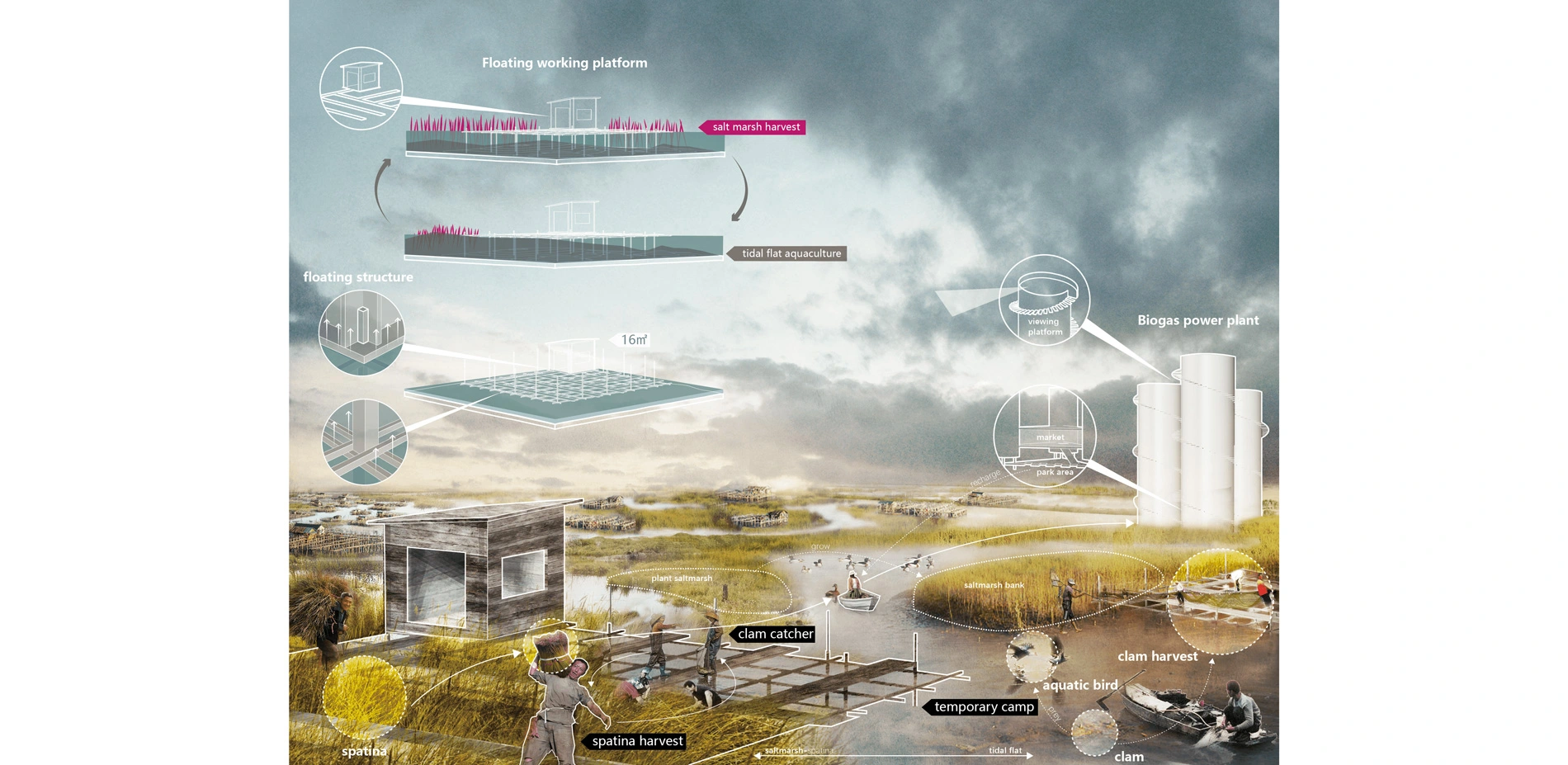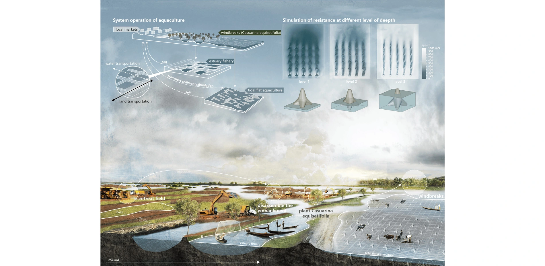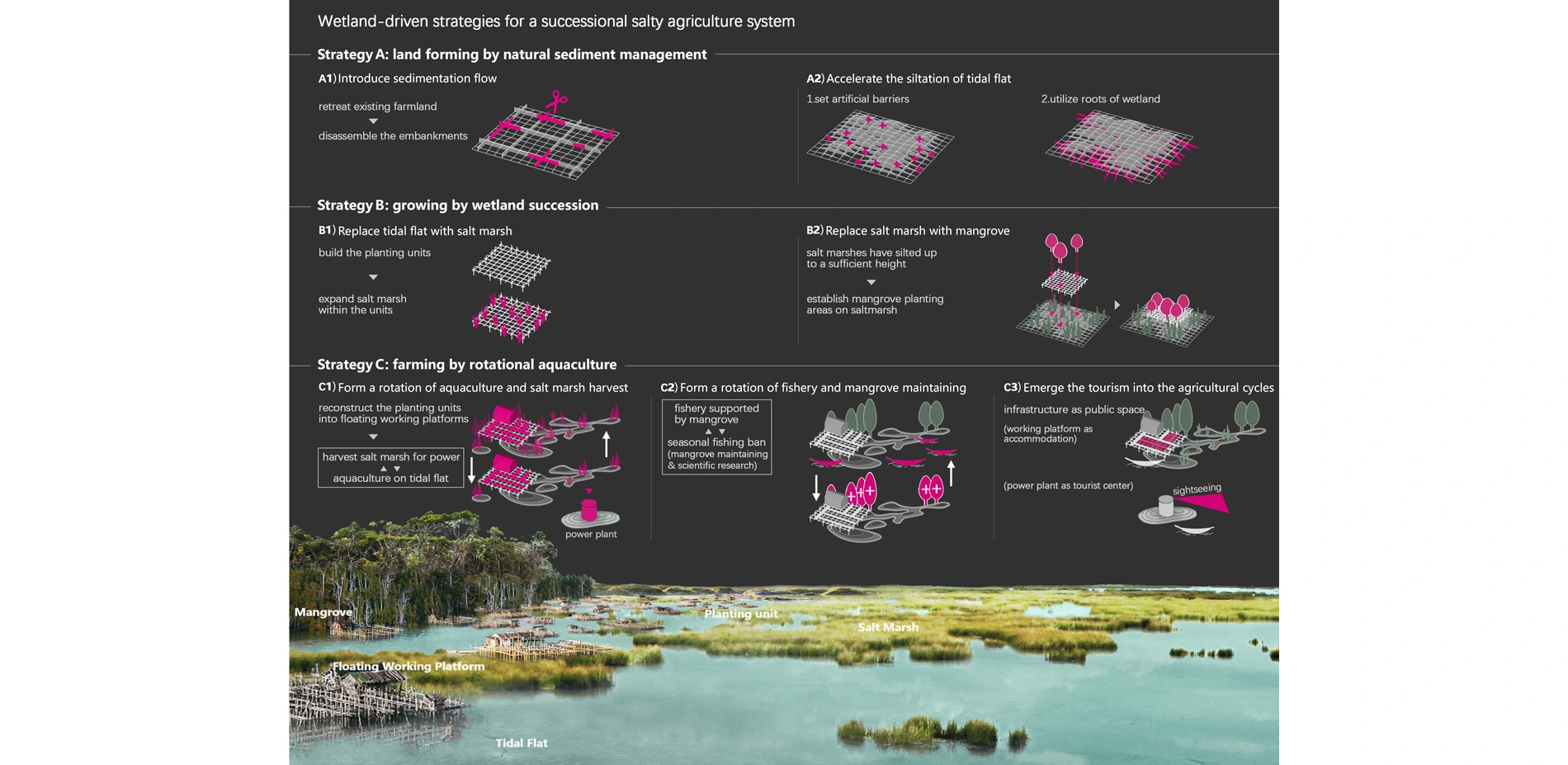 As the impact of SLR on coastal environment is an ever-change process, the fixed agricultural landscape planning is difficult to respond to coastal changes to survive and keep working in the future. The concrete coastal hard engineering infrastructures block the dynamic connection between landscape system and marine environment, and simultaneously with greater risk leading to increasing losses. Inspired by the strong adaptative capacity of wetlands to transform under SLR, the design hence improve the ability of transformation to provide agriculture with a motive force compatible with SLR. This coastal wetland-driven agriculture model would turn the risk of inundation to opportunities for future production. With sea level rising, successional salty agriculture model can create new value of agriculture, ecology and social culture by forming various agricultural systems, each of which has roles to perform and benefits each other within different submerging regions.