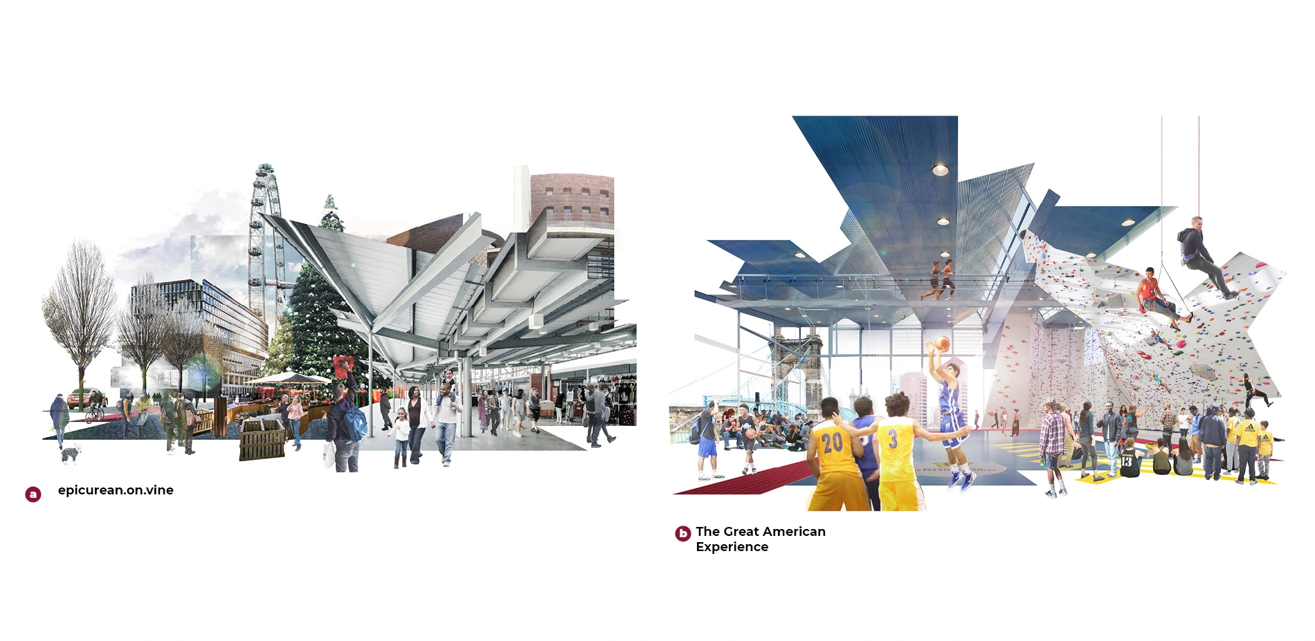 Flanking the stadium, Elm Street is seen as an extension of the convention center, populated with a core retail hub, restaurants, food trucks, large urban plazas, and an iconic stadium hotel. On the western edge of the site, Innovation Square and Concrete Green keeps today's function while introducing new uses. Innovation Square and the larger Supply Unchained Campus sits above parking that provides spaces for stadium and daily use. This public plaza serves as a common ground for STEM school students and campus employees and sits in contrast to the gritty infrastructural nature of Concrete Green, a new hybrid public space.