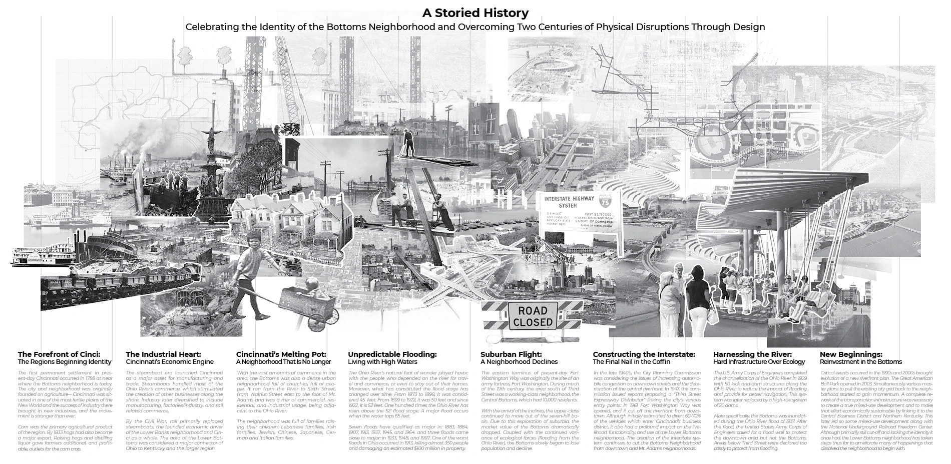 "The CincyStitch" is a multidisciplinary project, with students from two schools and four departments, that looks at planning, design, phasing, and funding solutions for "The Banks", the central waterfront neighborhood of Cincinnati, directly adjacent to the downtown area. The Banks, as its name implies, has traditionally been considered the fringe of Cincinnati-- industrial in nature, perpetually forgotten and underinvested, but historically diverse with a storied history. In response, our design creates threads of Culture + History, Public Realm, Transportation, And New Economies to reposition The Banks as the nexus of an evolving region, stitching and relinking the neighborhood into the area's physical, social, and economic fabric. In addition, this proposal does not start from a hypothetical blank slate, but recognizes and embraces the past decade's $1B of private and public investment. Moreover, it respects the complexities of building over and under existing infrastructure, within a floodplain, and forging an integrated district that pays heed to the Queen City's longstanding culture of neighborhoods.