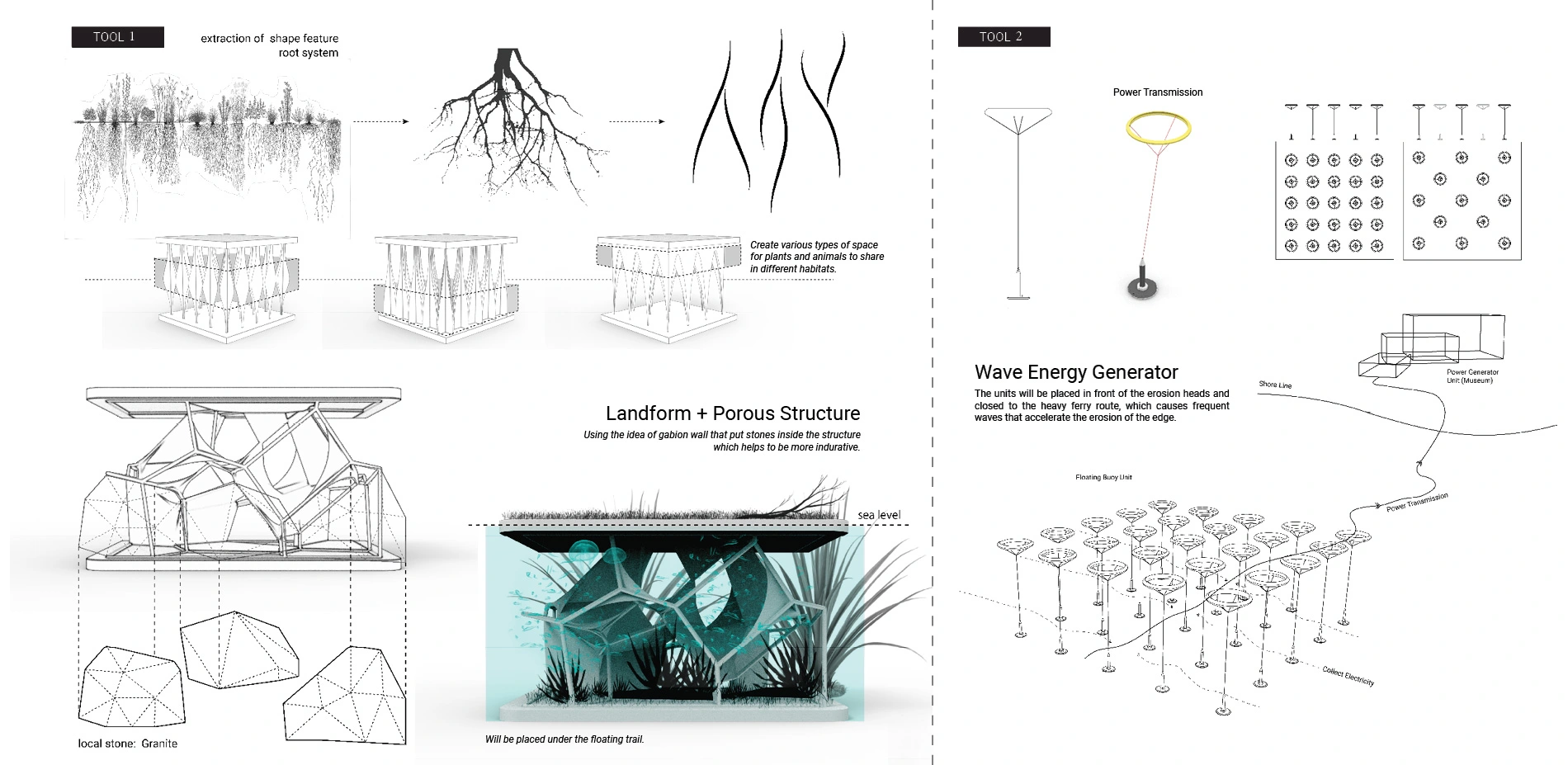 Seagrasses provide many essential services to people as well, but many seagrass meadows have been lost because of human activities. The new habitats are composed of grassy berm colonies that propagate the growth of seagrasses, which provide shelter and food to a diverse community of animals. Productive landscape as seaweed farming, at the same time, can be implemented next to the berms in order to associate with the culture of immigrant fishers in the 1900s, and provide locals with organic food resources.