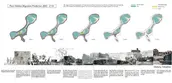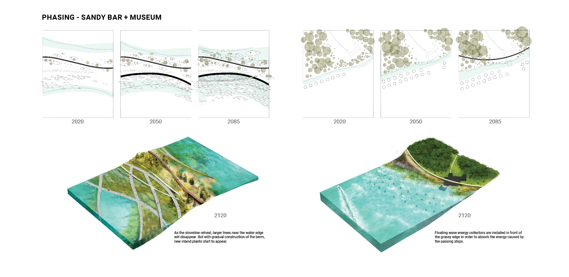 The future scenario was built upon the phasing from previous years. As the shoreline retreat, larger trees near the water edge will disappear. However, with the gradual construction of the berm, new inland plants start to appear. Salt-tolerant grasses are cultivated on the water edge and expand inward and outward to stabilize the eroding edge. On the museum side, floating wave energy collectors are installed in front of the grassy edge in order to absorb the energy caused by the passing ships.