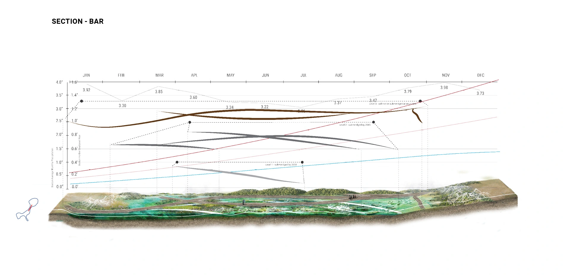In the future, the salt marsh will directly connect to the sea due to the sea level rise. The water edge is reinforced by beach grasses and seagrasses. As the habitat continued to establish, migratory birds like the Great Blue Heron, Sea duck will come to the area for food and habitat.