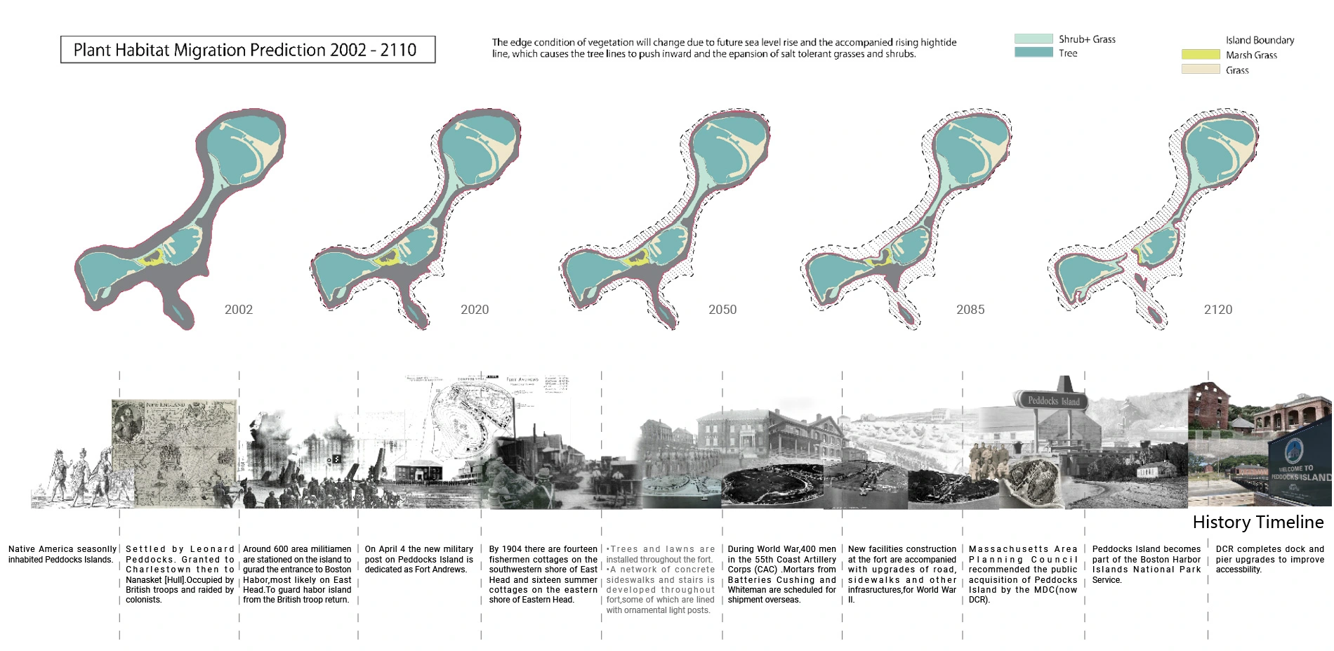Facing the challenge of climate change and sea level rise, the historical remnants and precious habitats of Boston Harbor will be gradually submerged by the water. At his moment of history, a phasing strategy needs to be taken into consideration as simply persevering or protecting the island in the current situation will not sustain the island in the future.