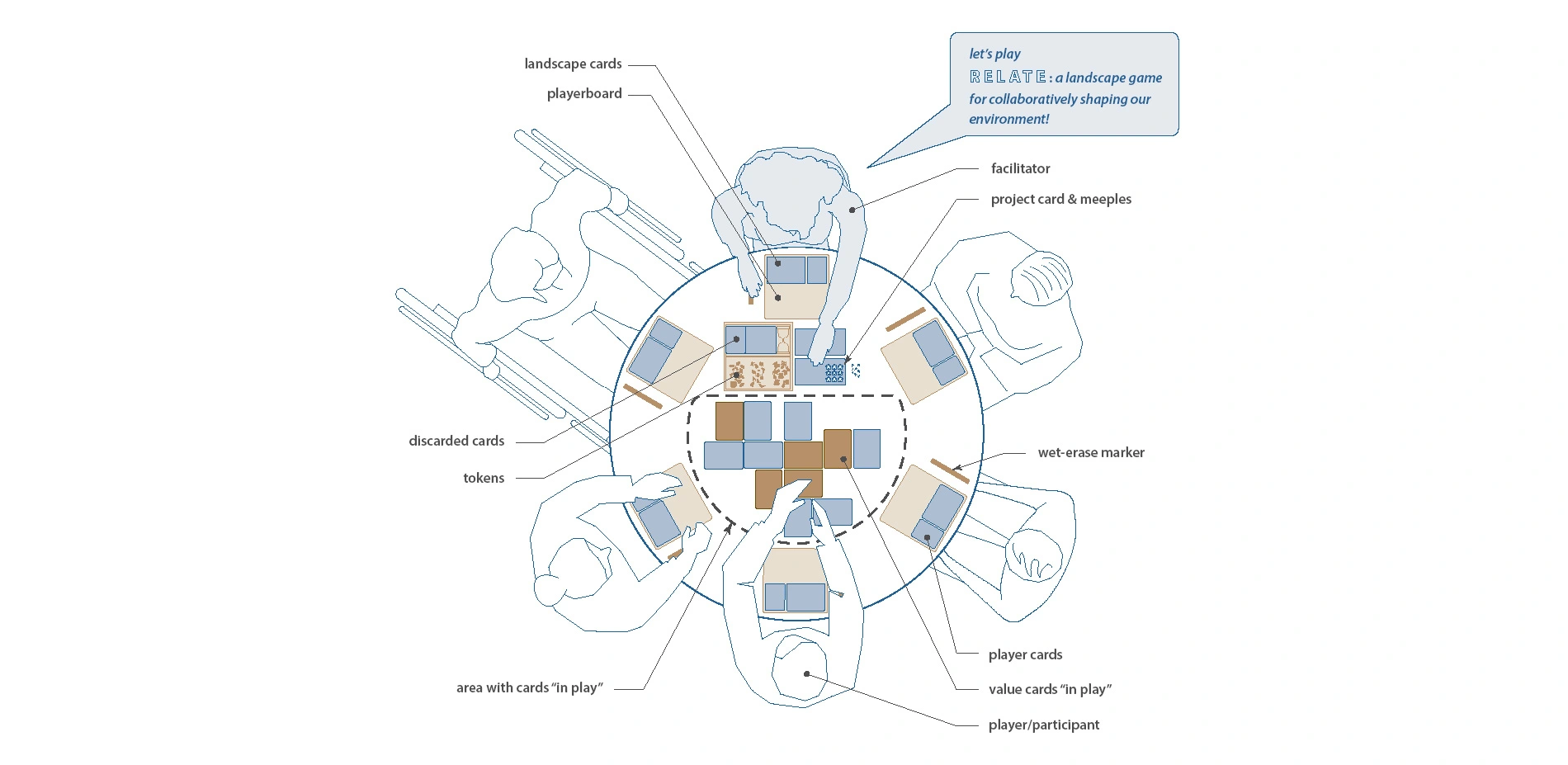 The significance of games as a communication and learning device relative to landscape architecture practices lies in several essential concepts in the game design discourse and leaders in participatory practices. Josh Lerner (2014), the Executive Director of the Participatory Budgeting Project, states that games are unique in that they "require player participation," and it is through this participation that players learn to not only understand the rules of the game, but also "criticize and change it when necessary" (Making Democracy Fun, 17-18). Critique, as we know in the design profession, requires a level of respect and understanding, and is an important form of communication. A landscape game, such as RELATE, builds upon the productiveness of critique and natural, voluntary participation and amicability of playing a face-to-face game, by incorporating landscape elements and mechanics in the game components and gameplay.