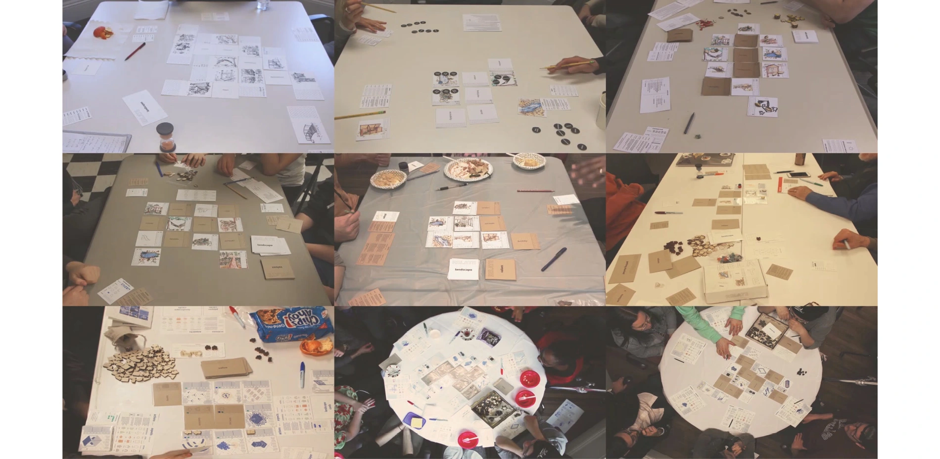 Phase 1: Relate, is silent, and meant as an initial "brainstorming session," in which individual interests and interpretations introduced without coercion. In this process, players start to interpret the landscapes and value cards, as well as the aspects: environmental, social, and material. Players also start to react and pick up on what other players put down, actively thinking about the relationships that are being made as others play out their cards. Phase 2: Reflect is where the scoring and discussion comes. Scoring is collective and is visually indicated by "meeple" tokens placed on your project card for everyone to see. Players start to discuss and understand the different interpretations and expertise each player brings to the table and start to talk about the landscapes, values, and aspects as they relate to one another. The round ends with three collective decisions that emphasize the power of collaborative work.