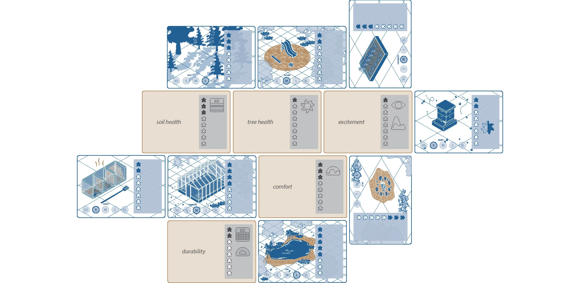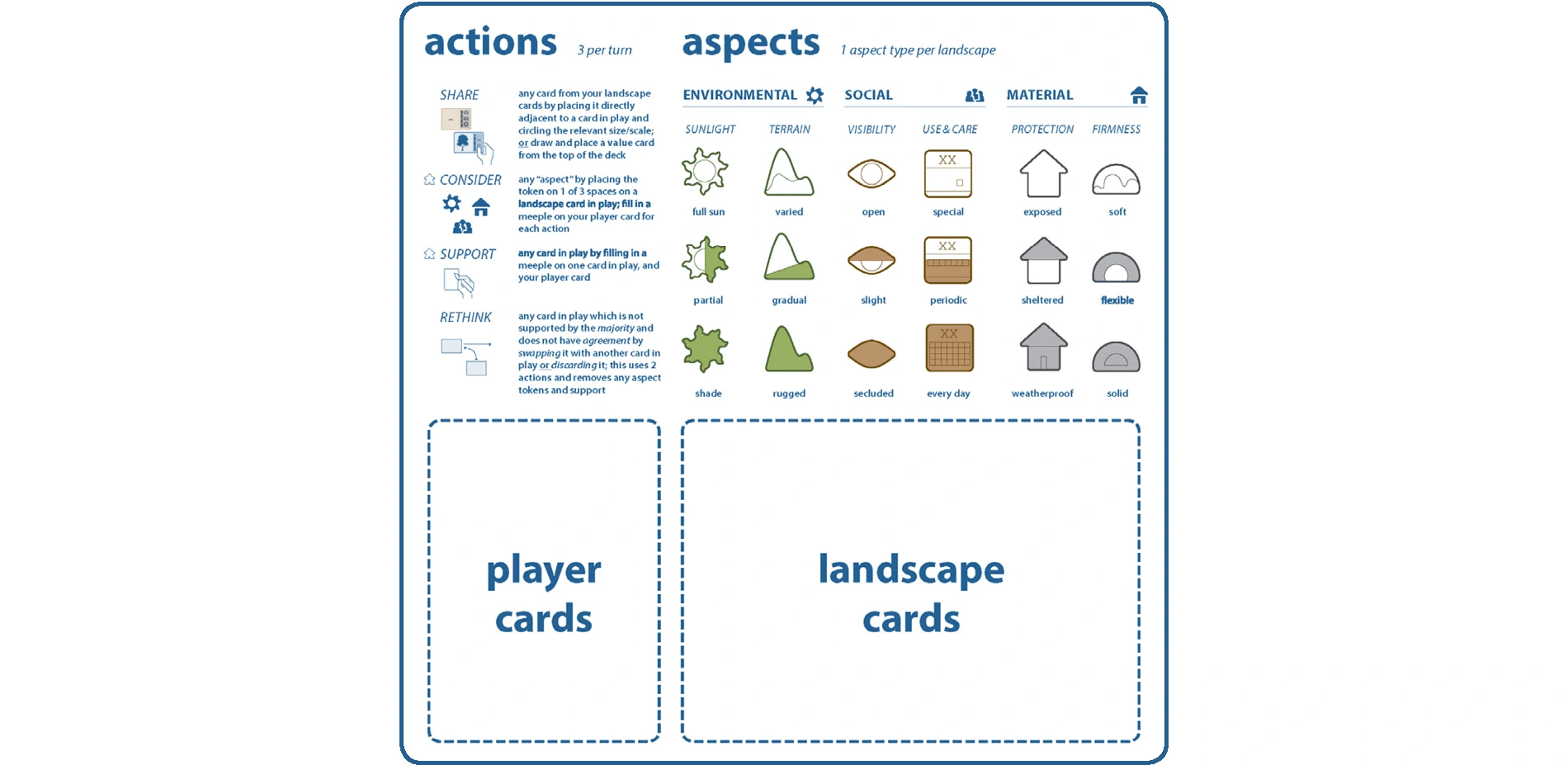 After unpacking and reviewing the rules, the game begins by filling out a Project Card, which establishes a collectively decided prompt or "site" for the playsession—this could be real or imagined, and is often a location that each player is familiar with. Then, all the playerboards, player cards, and landscape cards are distributed and reviewed. Players can even add their own "landscapes" by sketching and labeling them on the blank cards. Each of these components allow equal access to what "actions" can be made on your turn, as well as the establishment of player identity, and already start to contribute to a sense of ownership over the project as each player takes turn choosing their landscape card deck.