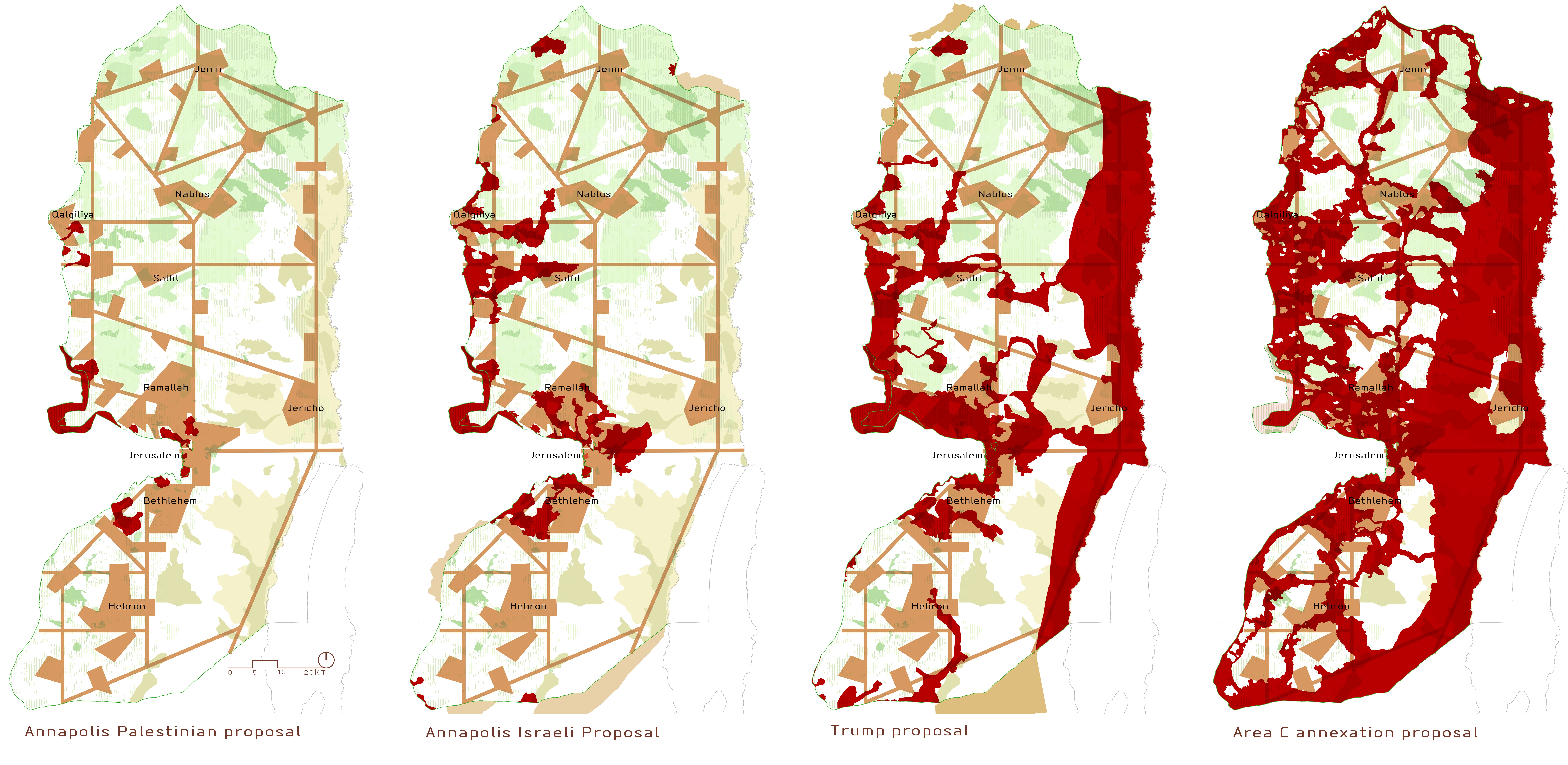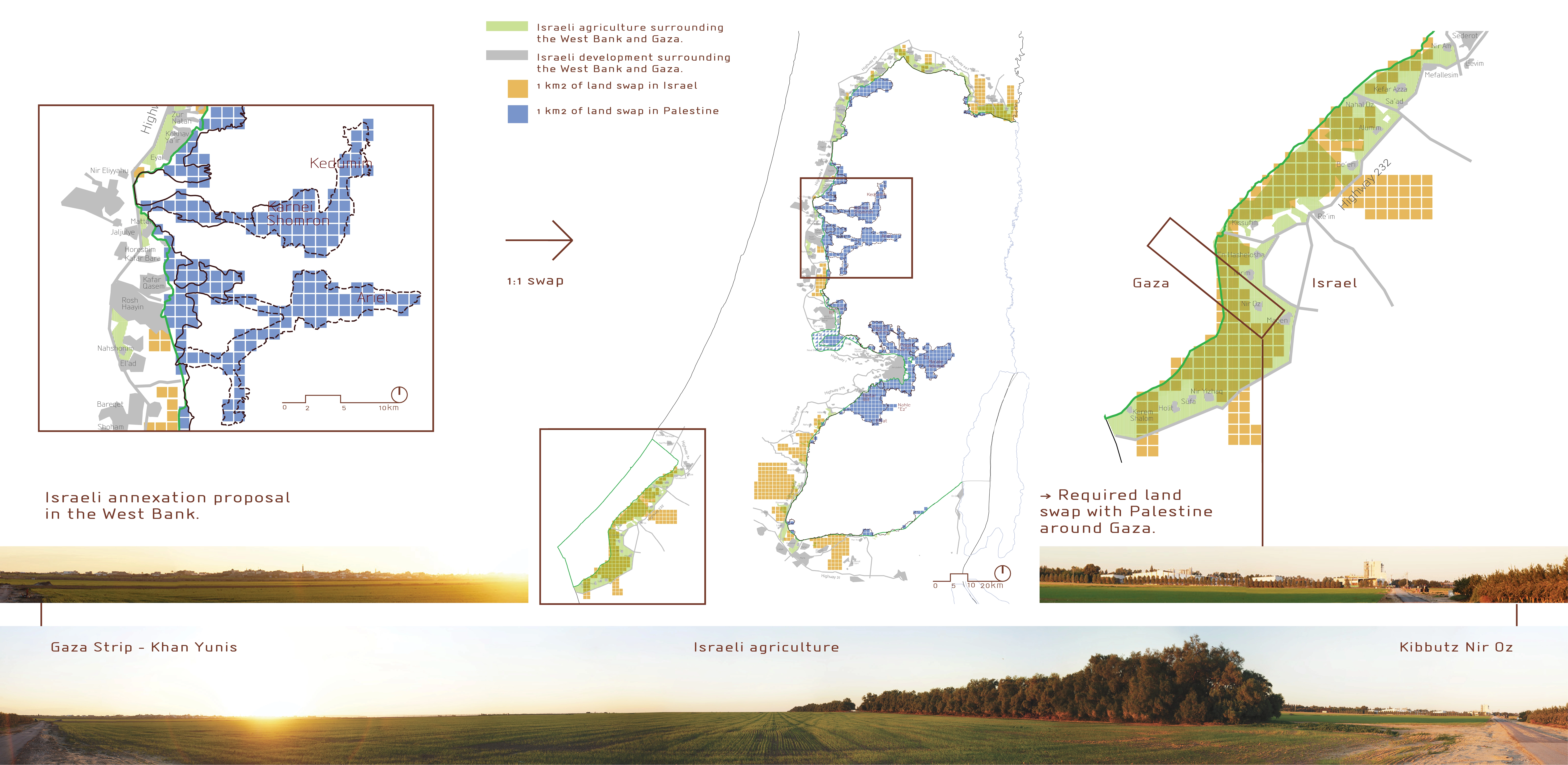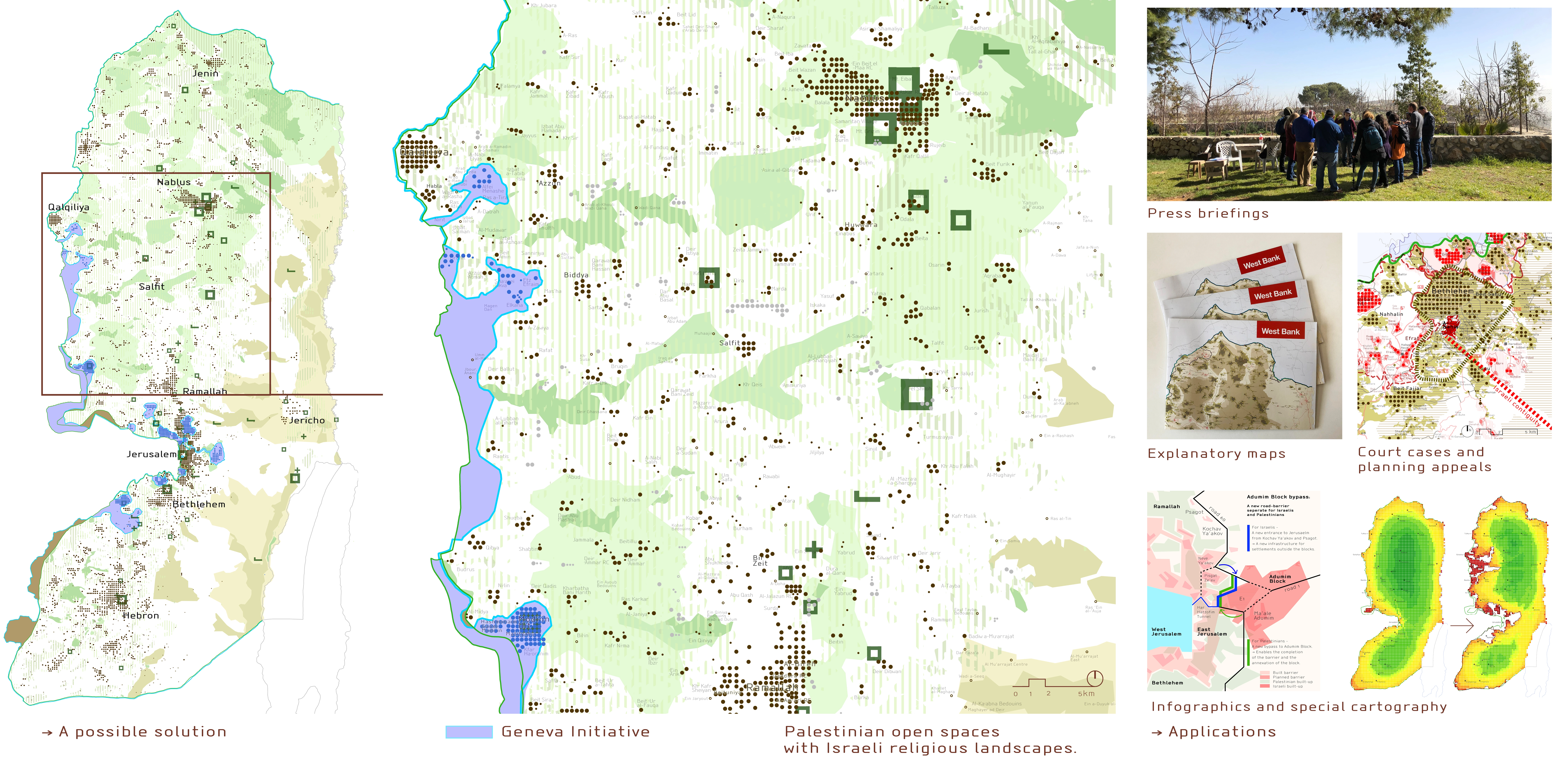 This analysis is complemented by effects of landscape on the possibilities for "land swaps" between Palestine and Israel. The three studies then converge to form territorial scenarios for a possible agreement. We thus see how a research and planning of landscape directly affects geopolitical possibilities, and the character of communities, such as the number of settler population Israel will need to evacuate.
