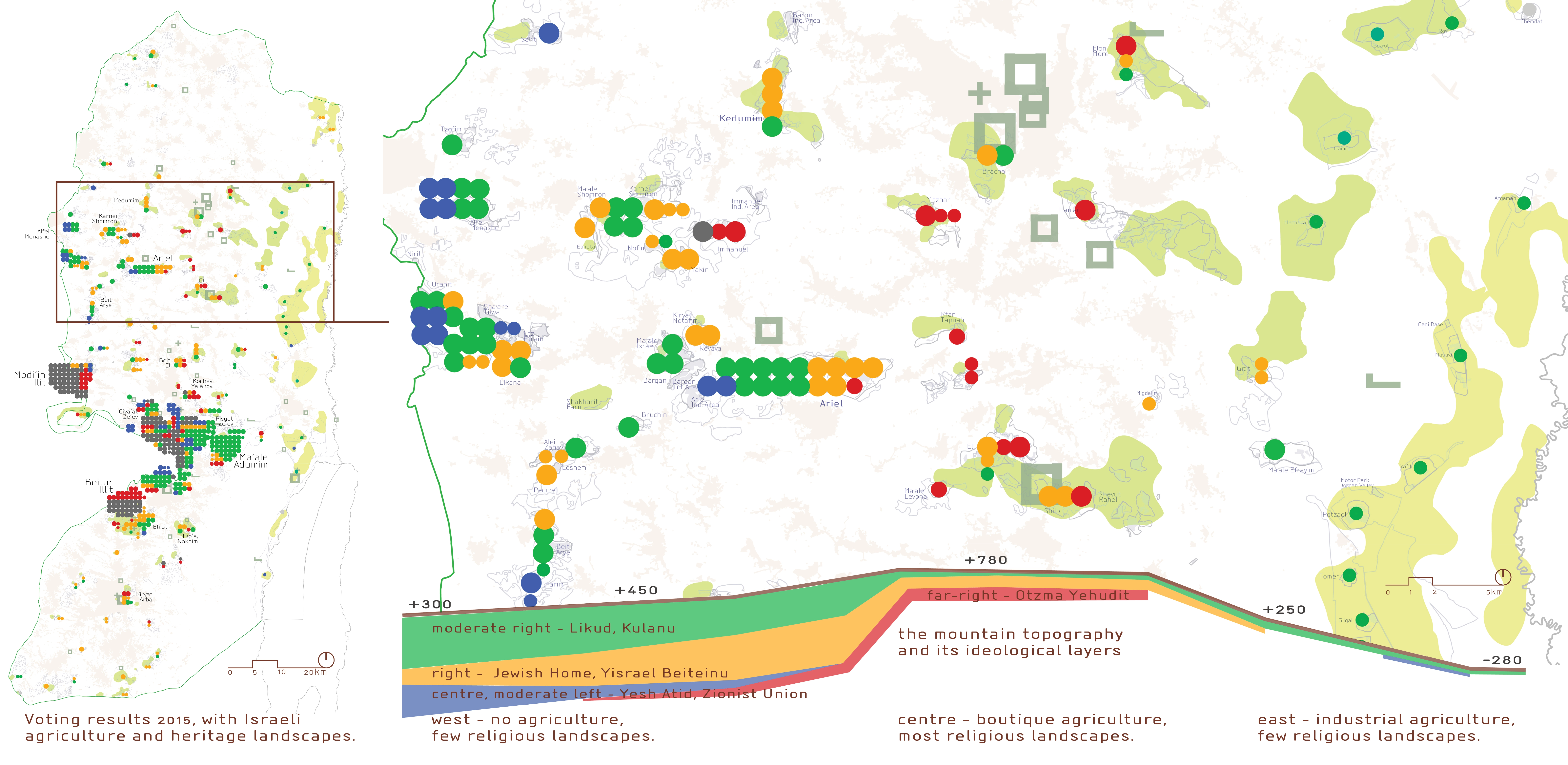 In contrast, with an aim to consolidate wide geopolitical continuities, keeping Palestinian localities, rather than Israeli, as the "islands", Israel implements a settlement by landscape. It emphasises religious, spiritual, heritage values. The Israeli 20th century Zionist agriculture of the plain was that of the Green Revolution - large-scale, industrial agricultural landscape in which Israel was always at the forefront. This is also true also to the secular, ideologically moderate, intensive farms in the Jordan valley. However, the recent agriculture of the mountain settlements emphasises "terroir", traditional, religious characteristics. For example – Gva’ot Olam – one of the most extremist outposts in the West Bank – is also the largest organic egg farm in Israel. It sells most of its produce to left-leaning liberals in Tel Aviv. This is not a coincidence. The liberal “back to the soil” is intertwined with the same attitude in the far right.